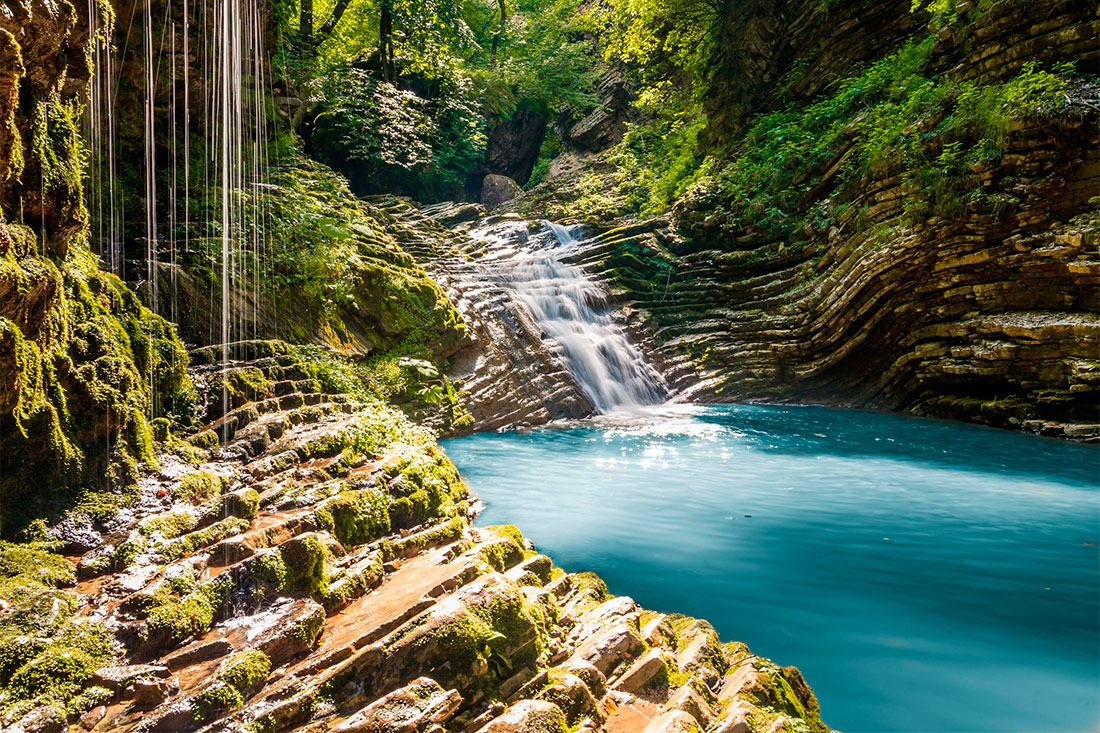 У Адыгеи нет выхода к морю, но это и не нужно — этому региону очень подходит лозунг «Кругом вода». И весной все эти водные аттракции выглядят особенно живописно. Это касается и парка водопадов, расположенного по реки Руфабго. Кстати, к ним от Хаджохской теснины ехать не более 10 минут. Два этих природных объекта можно изучить последовательно.