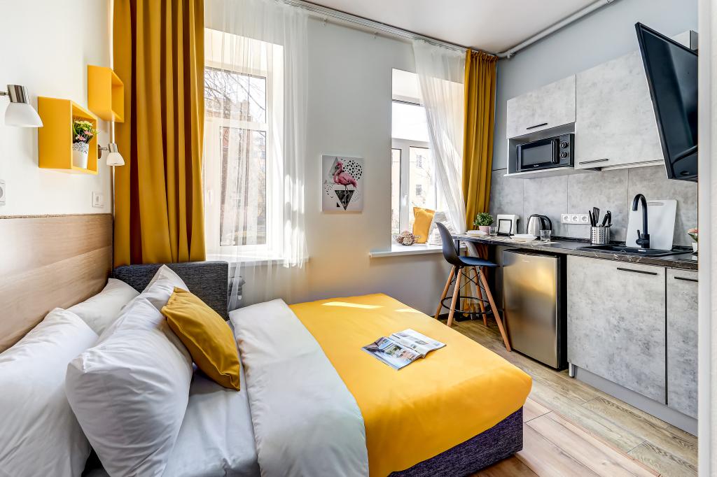 Это апартаменты в апарт-отеле Sokroma, а не квартира от частника. Очень милые и удобные, с высокой оценкой. У этого отеля много красивых апартаментов в разных районах Питера. Цена в сутки летом 2021 года — от 3900 ₽ за двоих.