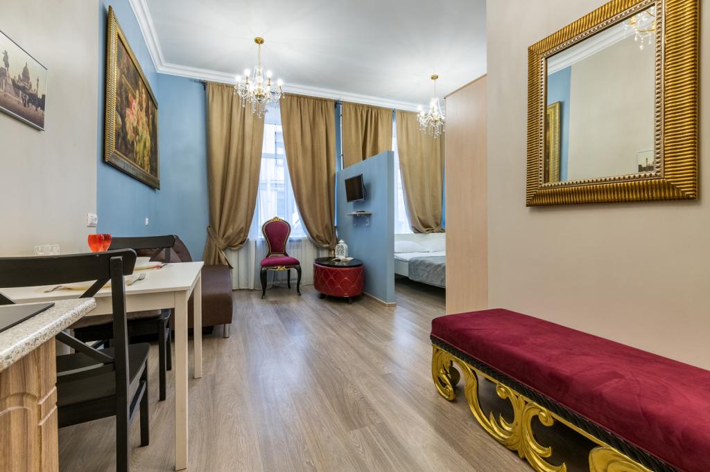 Если хотите почувствовать питерский дух, то вам нужно пожить в этих апартаментах: необычные решения в планировке, портьеры, картины, люстры. Это не квартира от частника, а апартаменты в отеле «Дом литераторов», на 5 тематических номеров, но в них царит домашний уют. Есть всё для комфортной жизни: мини-кухня с посудой, стиральная машина и сушилка, кондиционер, утюг и прочая бытовая техника. Цена — от 4600 ₽ летом и от 2000 ₽ в низкий сезон.