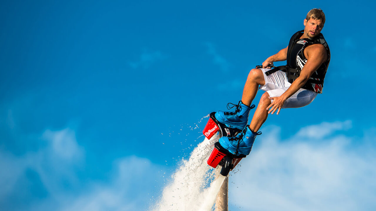 Хотите новых ощущений? Тогда вам точно придется по душе полет на флайборде. Летающие над водой люди, стоящие на специальной доске выглядят фантастически. Флайборд или водометные ботинки работают по простому принципу: в движение доску приводит струя воды, которая с силой выталкивается из сопел прямо под вашими ногами.