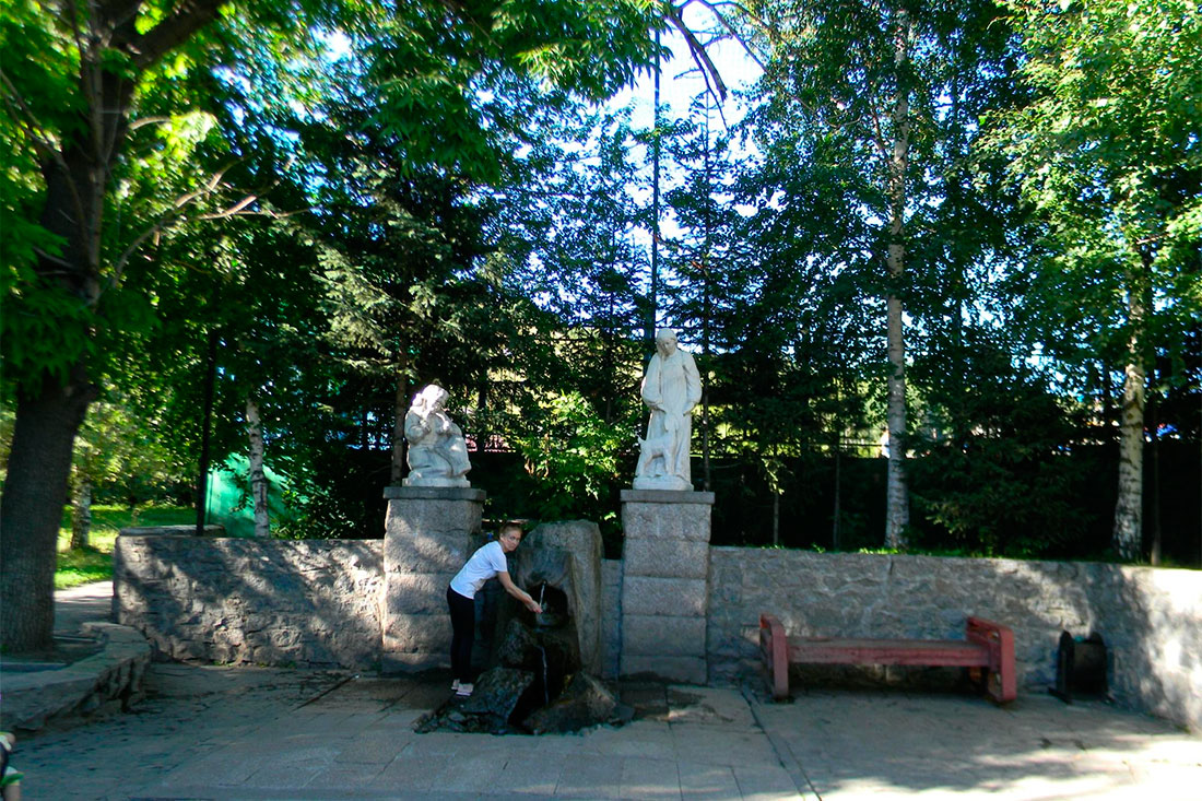 А напротив сквера камней построили Родник. Тоже знаковое место. Родничок обустроили лавочками, украсили статуями, выложили камнями и теперь возле него постоянно очереди — вода очень чистая, прохладная и вкусная!