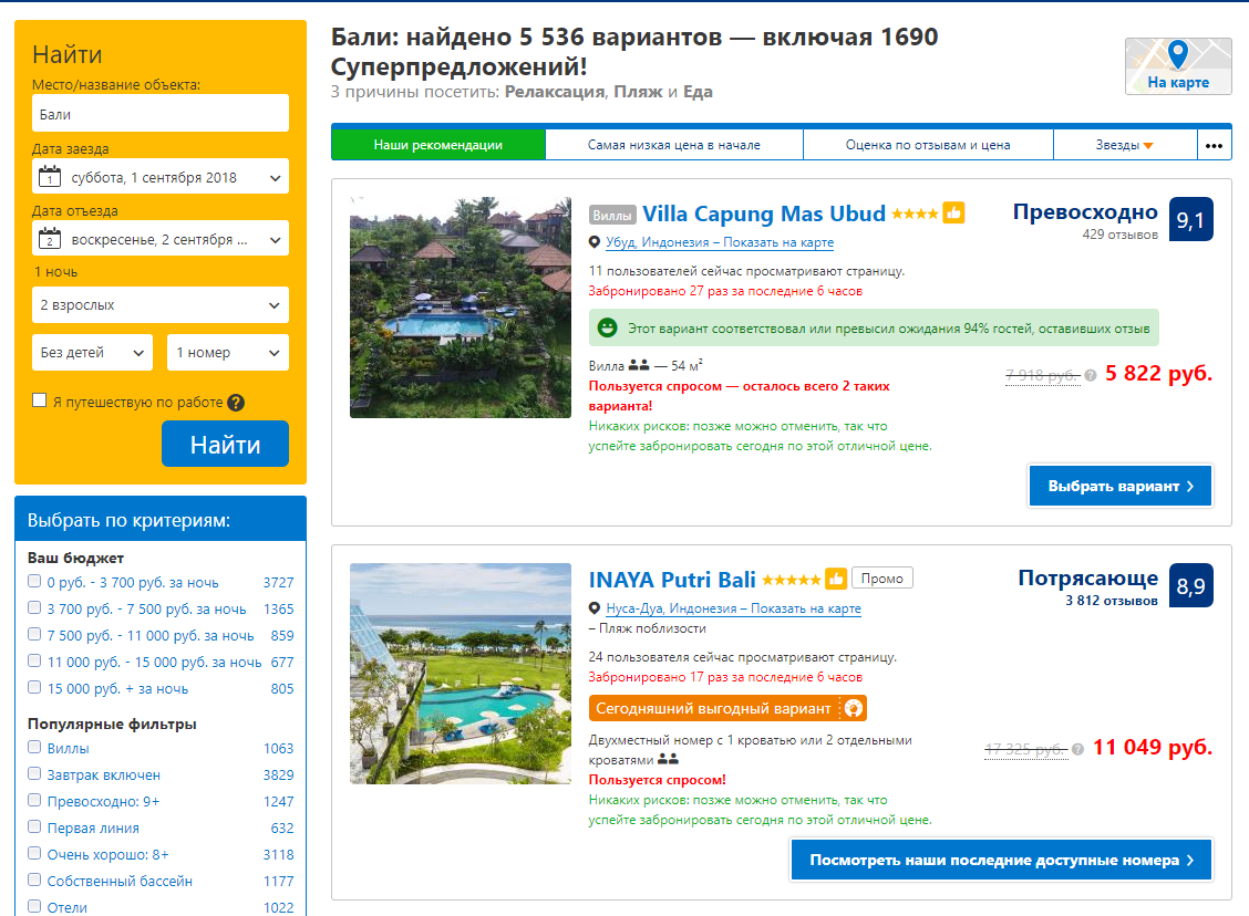 После этого вы, используя другие фильтры (ценовой диапазон, рейтинг отеля и количество звёзд у него, расположение отеля и прочее), вы сможете самостоятельно выбрать наиболее подходящие и привлекательные отели. С помощью сортировки отелей по рекомендациям, «звёздности», стоимости и так далее вы сможет составить личный рейтинг, благодаря которому вам будет очевиден ваш «отель номер один»