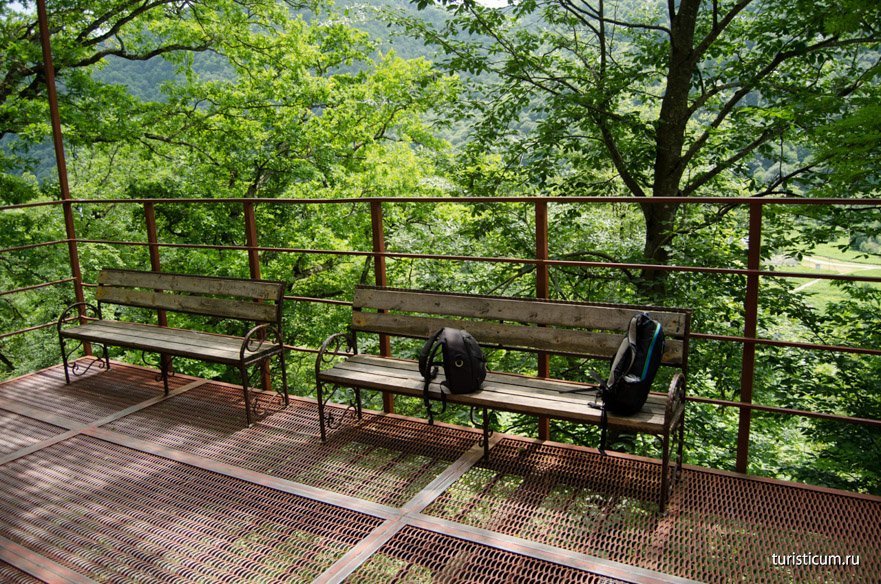 В конце маршрута установлена площадка, где можно передохнуть. Ближе подниматься к Архызскому лику запрещено. С этой же площадки открывается вид на Нижне-Архызское городище, ну почти открывается, мы то знаем, что оно именно там.