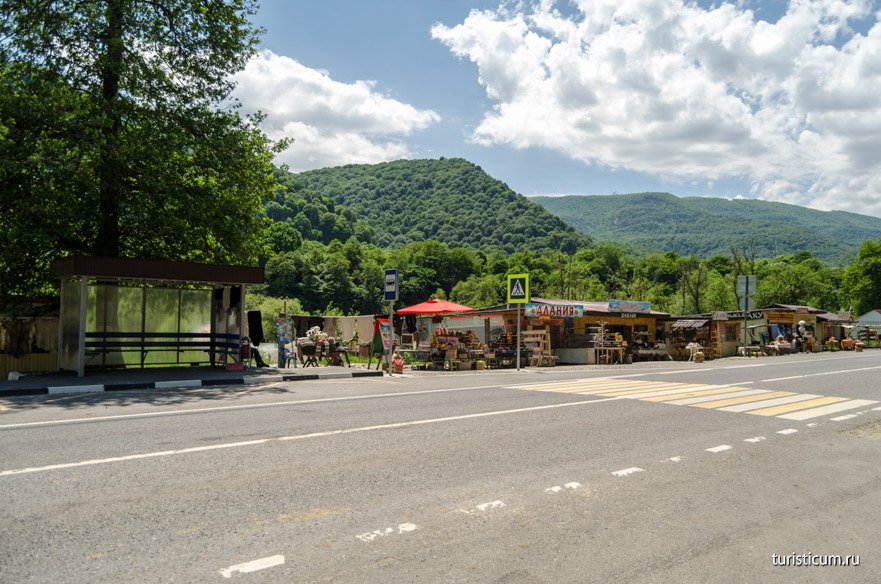 Здесь можно перекусить после путешествия по Нижне-Архызскому городищу, восполнив свои силы хычынами и горным чаем. Здесь же расположена остановка общественного транспорта, с которой мы поедем обратно в Архыз. Но есть важная особенность. Хоть маршрутки ходят по расписанию, едут они быстро и если вы не успеете махнуть рукой могут проехать мимо. Поэтому если вы видите маршрутку обязательно проголосуйте!