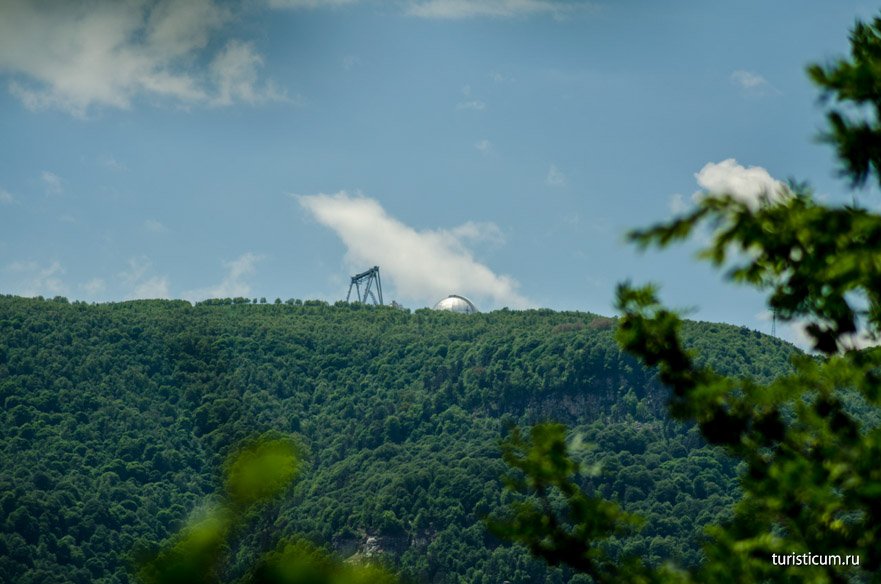 Спускаясь по ступенькам вниз перед нами открылся вид на Специальную Астрономическую Обсерваторию Российской академии наук (САО РАН), которая расположена на горе Пастухова. Туда тоже водят экскурсии, но самостоятельным туристам попасть туда будет проблематично. Если идти пешком, расстояние до обсерватории от трассы где находится Нижне-Архызское городище составит 6 км, а набор высоты составит 950 метров.