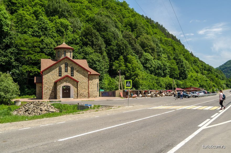 После посещения Аланского городища добраться до «Лика Христа» будет совсем нетрудно. Нужно перейти мост через реку Большой Зеленчук и двигаться по трассе направо в сторону станицы Зеленчукской. Буквально за поворотом вы увидите церковь на одной стороне дороги и рынок на другой.