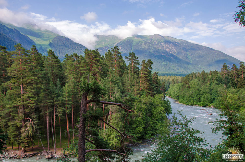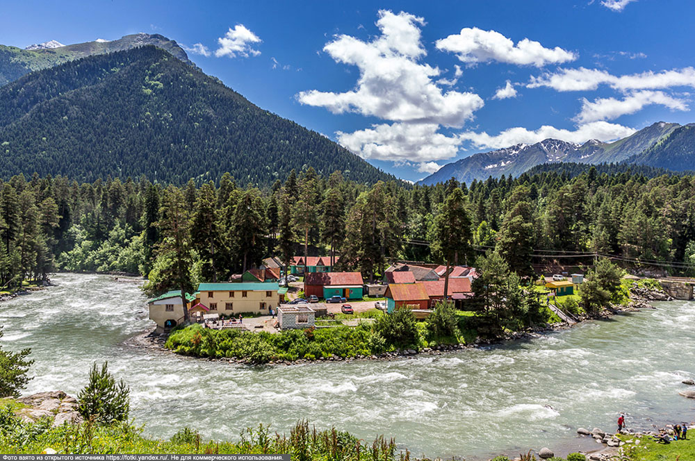 Весь Архызский район – это череда ущелий, которые веером уходят от Главного Кавказского хребта. Главный Кавказский хребет, вернее, часть его длиной около 30 километров, служит южной границей района. С севера поселок защищает другой хребет – Абишира-Ахуба. Горы на юге и севере достигают высоты более 3000 метров, самая высокая из них гора Пшиш (высота 3800 метров).