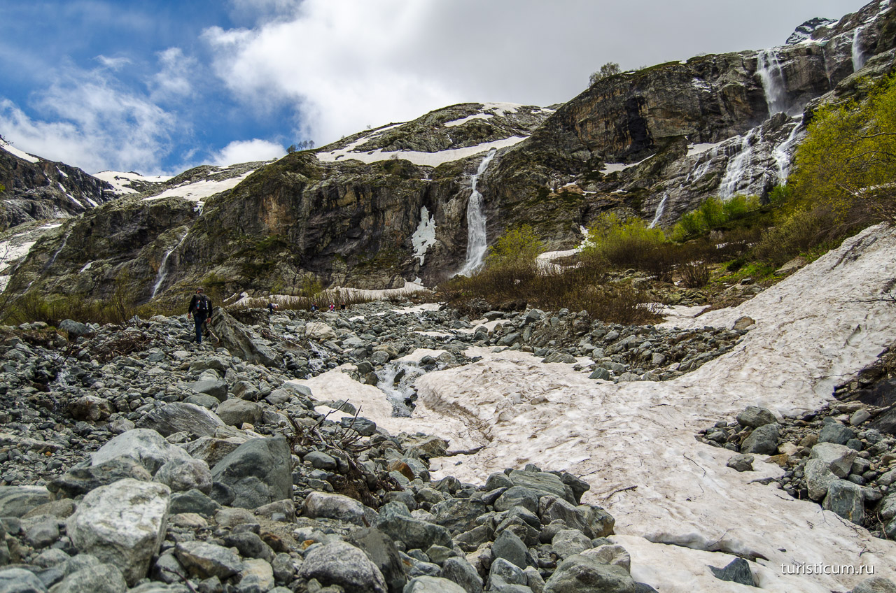 - Самостоятельные туристы и организованные группы начинают свой пешеходный маршрут к Софийским водопадам и Софийским озерам именно с одноименной поляны. Здесь можно купить экскурсию у местных проводников и доехать с ветерком до достопримечательностей Софийской долины. Истоки Софийского водопада находятся на горе София. С огромного ледника, лежащего под вершиной, талые воды устремляются вниз с оглушительным грохотом. Отсюда начинается горная река София, бегущая по долине между Софийским хребтом и хребтом Чегет-Чат.