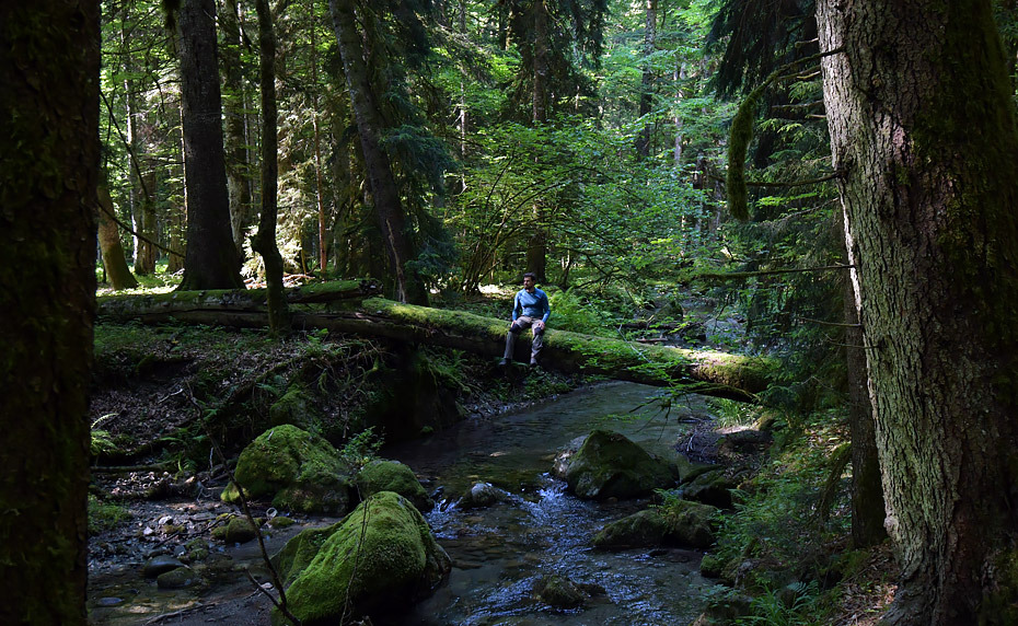 Выйдя из лагеря на кордоне Умпырь старайтесь не шуметь и идти тихо. Здесь, в лесу выше кордона, одно из любимых мест зубров и есть шанс встретить этих великанов! Крутые склоны отходят от реки, ущелье расширяется, Идём по «мишкиному лесу» под утреннее пение птиц словно в парке гуляем! бинокль в руке. По словам егерей встреча с зубром очень вероятна! Место и время для гармонии и умиротворения.