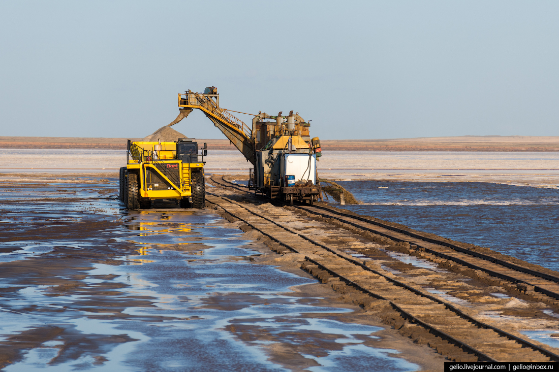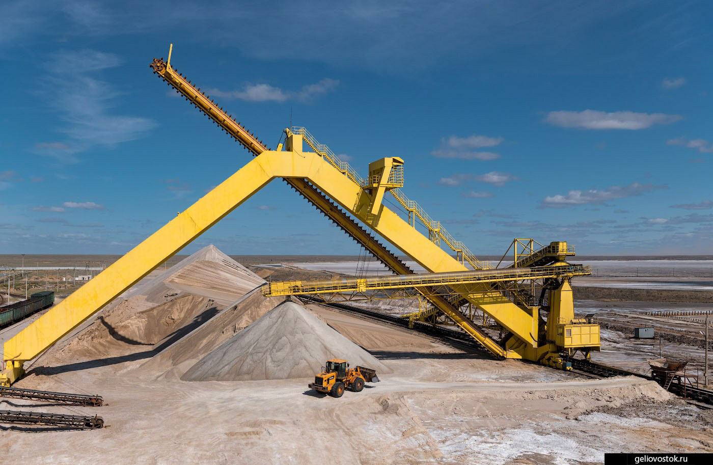 Одной из технических достопримечательностей этого места является сорокаметровый укладчик – стаккер-реклаймер, который хорошо видно издалека. В автоматическом режиме он насыпает огромный конус соли, чтобы она просушилась перед отправкой покупателю. Вообще к осени на берегу озера вырастают многочисленные соляные горы: зимой хлорид натрия не добывают, так как он смерзается и значительно усложняет работу.