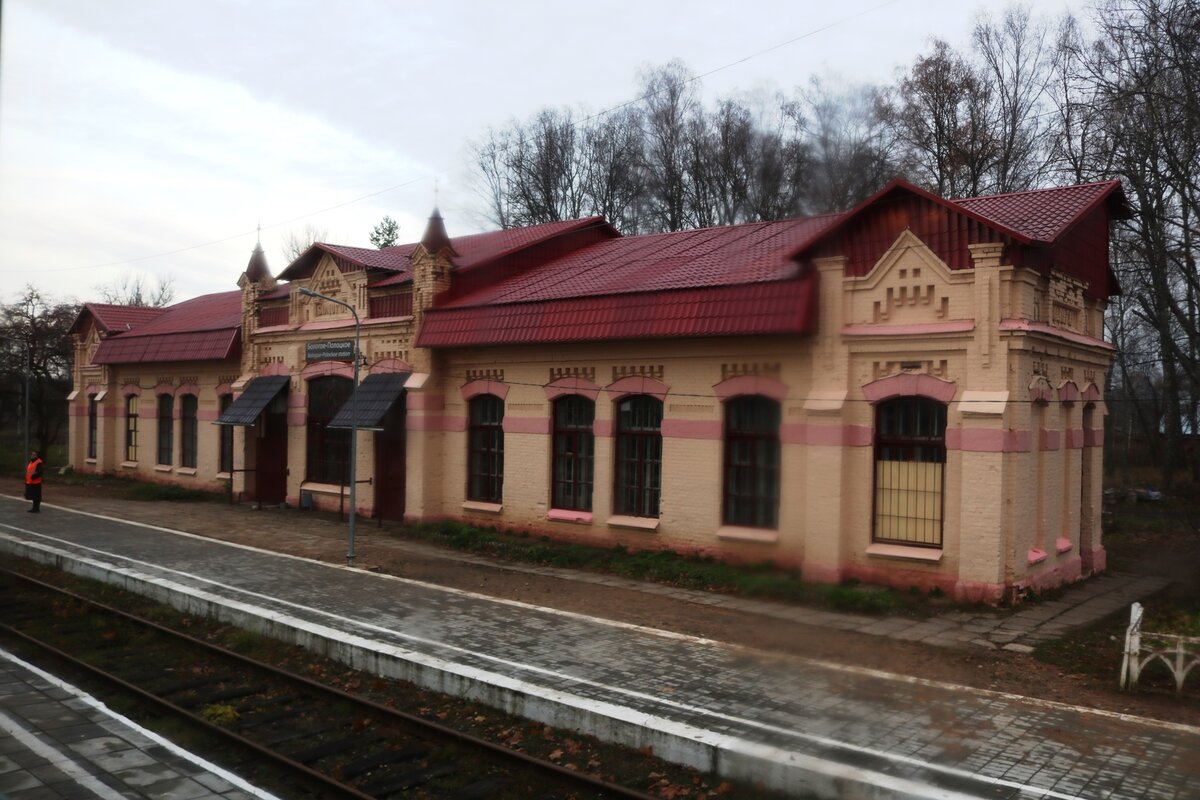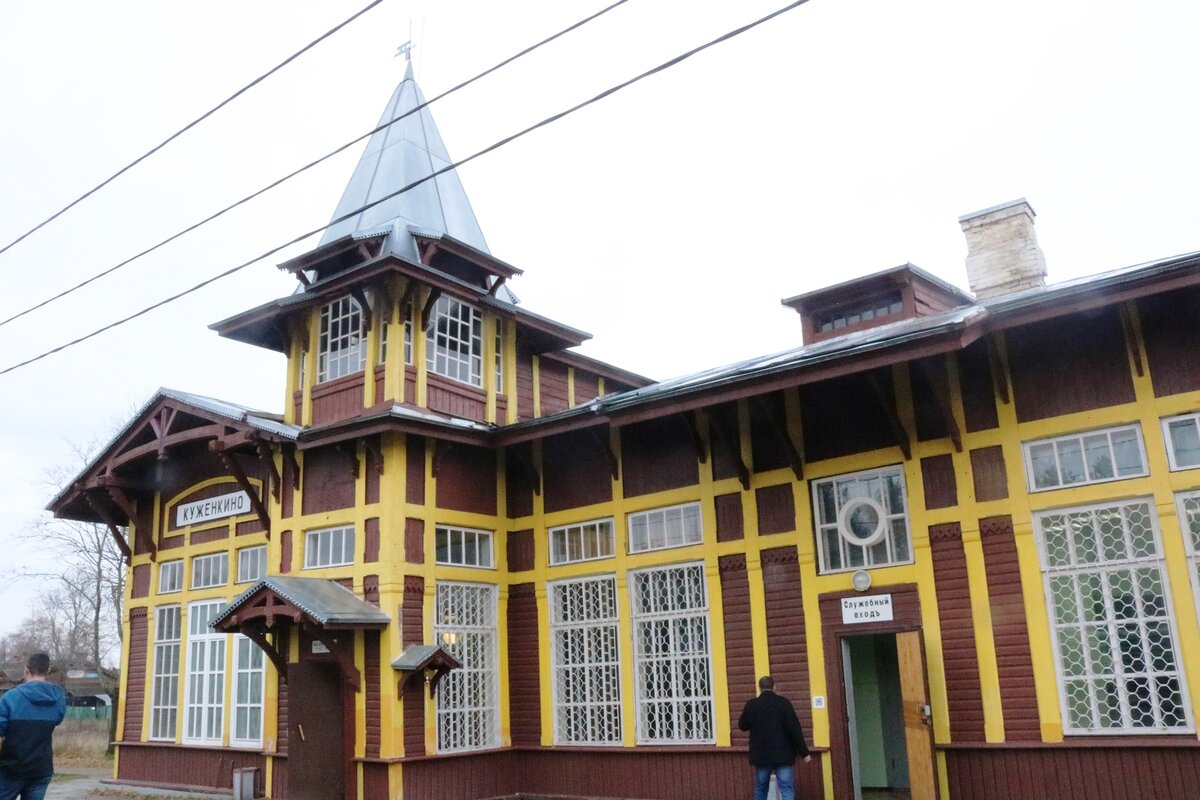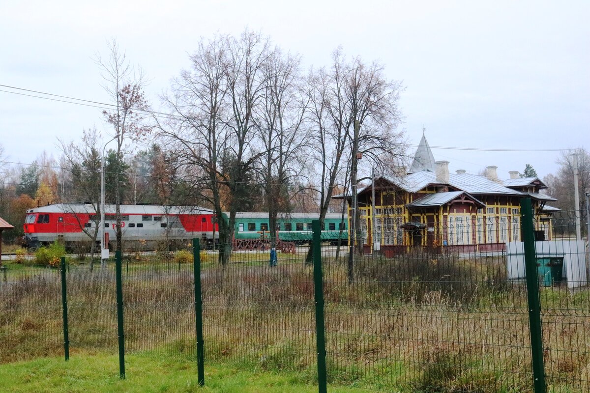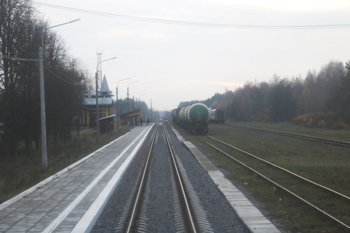Поезд, состоящий из тепловоза и двух вагонов, отправился точно по расписанию в 9:25 и, сделав две остановки, в 10:08 прибыл на станцию Куженкино, где была запланирована получасовая стоянка. Пока ехали, начальник поезда рассказал о ретро-проекте, истории БПЖД и извинился за отсутствие паровоза. От него я узнал, что дорогу строили в самом начале 20 века на французские деньги как часть магистрали Бологое – Седлец (Польша) для ведения военных действий Россией против Германии и Австро-Венгрии.