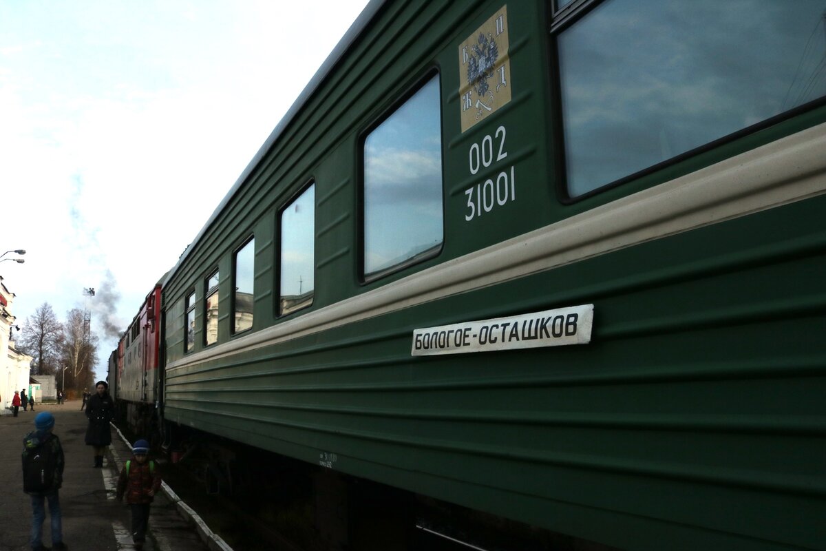 Поезд Бологое – Осташков подали быстро. Два сидячих вагона были выкрашены в зеленые цвета, имитирующие советскую окраску. К вагонам были прикреплены не используемые на современных поездах маршрутные таблички. Над номером вагона нанесен герб и буквы БПЖД.