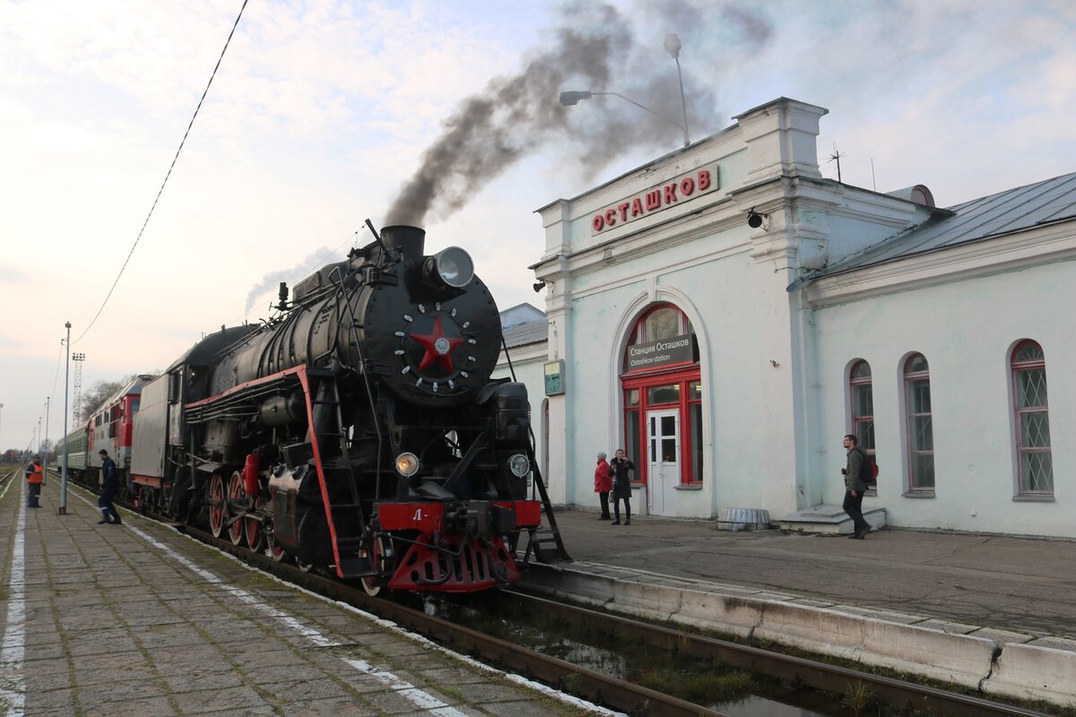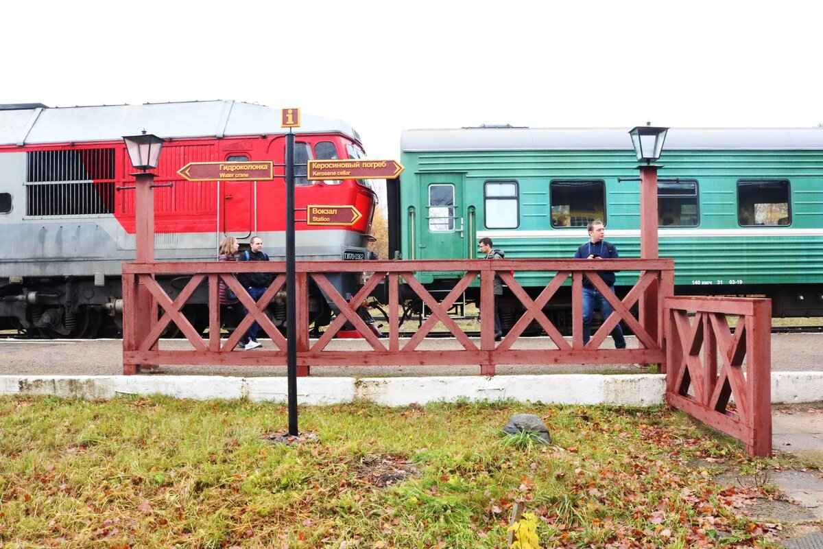 Ровно в 13:07 поезд прибыл в Осташков. На платформе меня встречал мой коллега, автор канала «Заповедная магистраль» Алексей Алексеев. Мало кто знает, что во многом благодаря ему и Алексею Вульфову вообще стал возможен этот проект ретро-поезда. На вокзале в Куженкино висят стенды с фотографиями Алексеева.