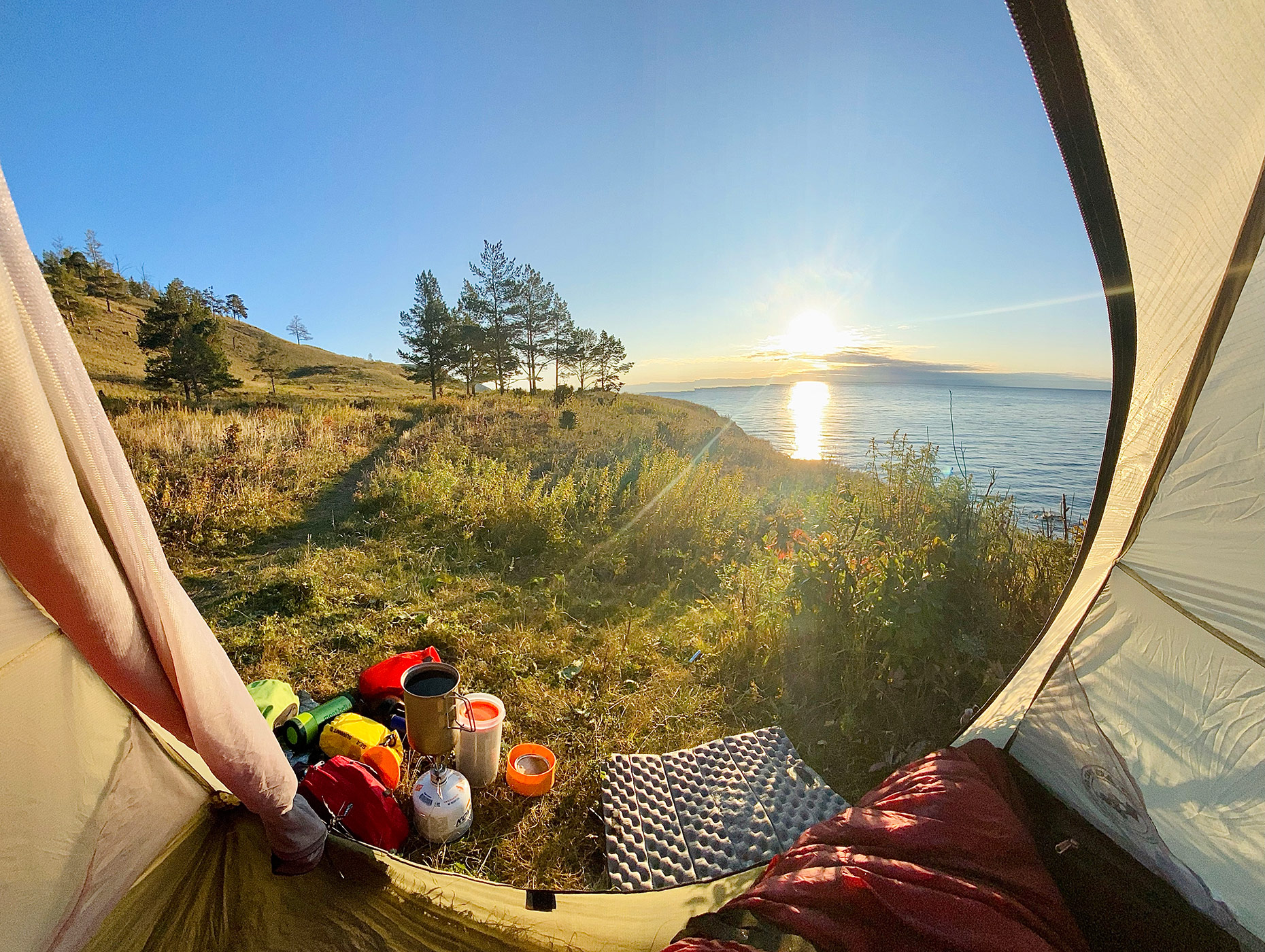 - 9:35 — люкс-стоянки на мысе Соболев. До Листвянки 28 км, то есть это примерно середина пути. Если идти с одной ночёвкой — оптимально ночевать именно здесь.