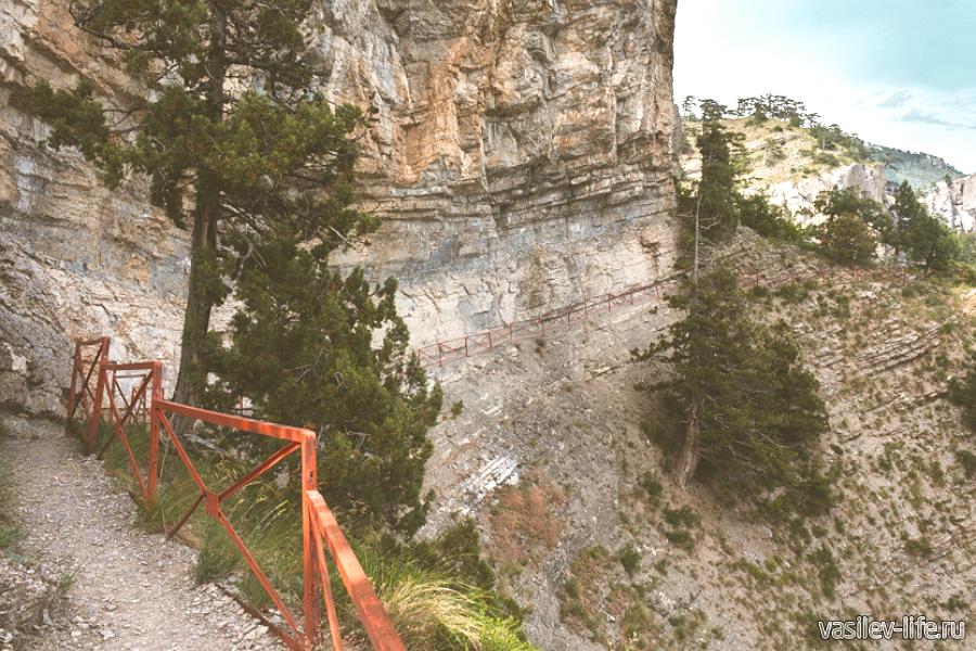 Маршрут оборудован скамейками, беседками, деревянными ступенями и обзорными площадками. Местами тропа идет по узенькому карнизу над пропастью вдоль вертикальных скал. Не стоит бояться – дорожка защищена металлическим ограждением.