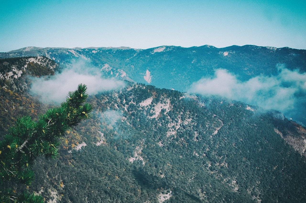 Постепенно лес расступается, и мы вдоль вечнозелёных можжевеловых «ковров» выходим на плоскую площадку (обозначена как «Костровище» на gps-треке), где уже можно расслабиться, посидеть с чаем и сделать очередную серию крутейших фото крымских гор: