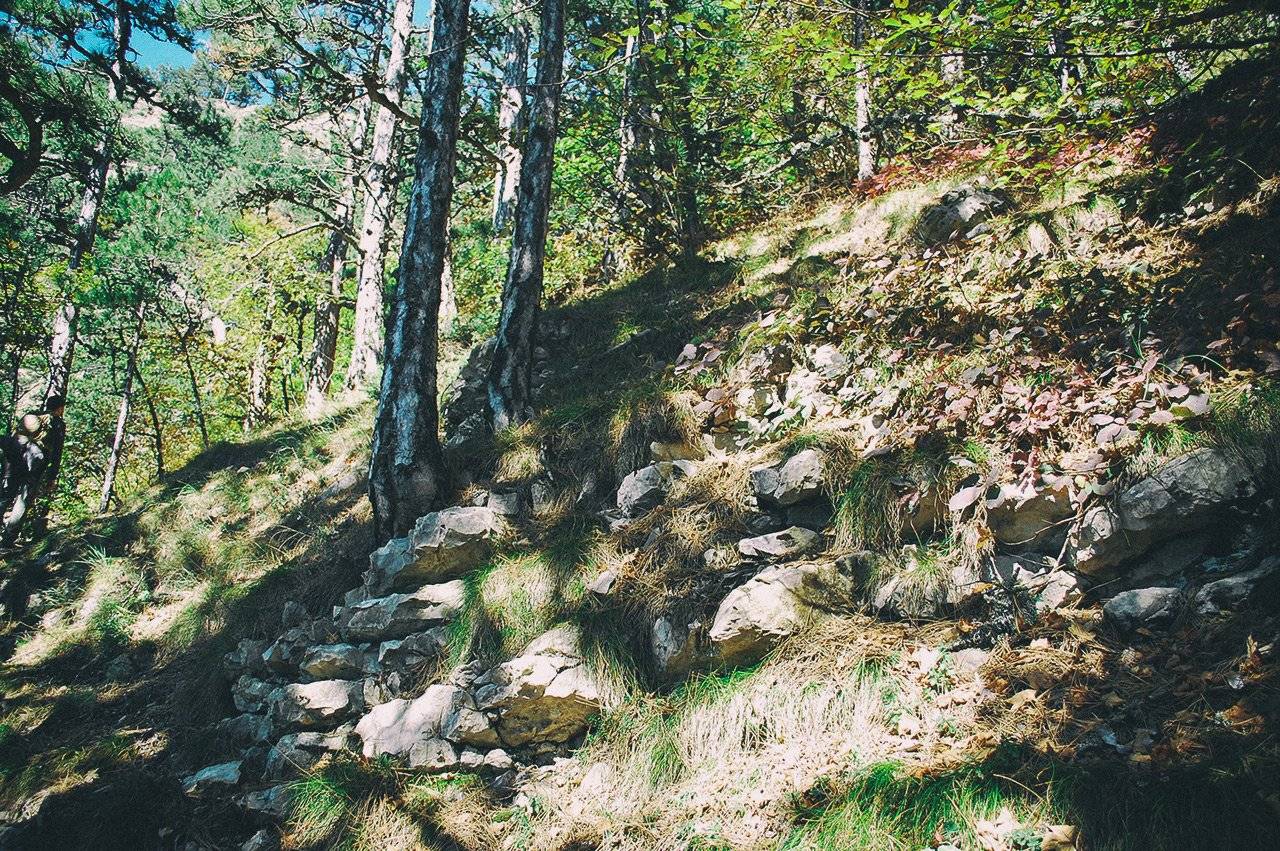 От Шапке-Узеня начинается подъем на гору Ставри-Кая. Здесь проложен удобный серпантин. Для тех, кто спешит сквозь все петли протоптаны сократительные тропинки.