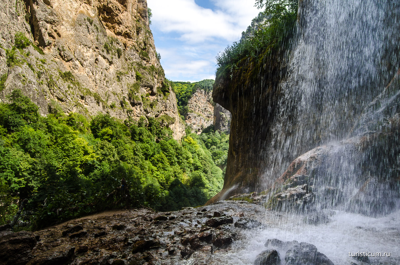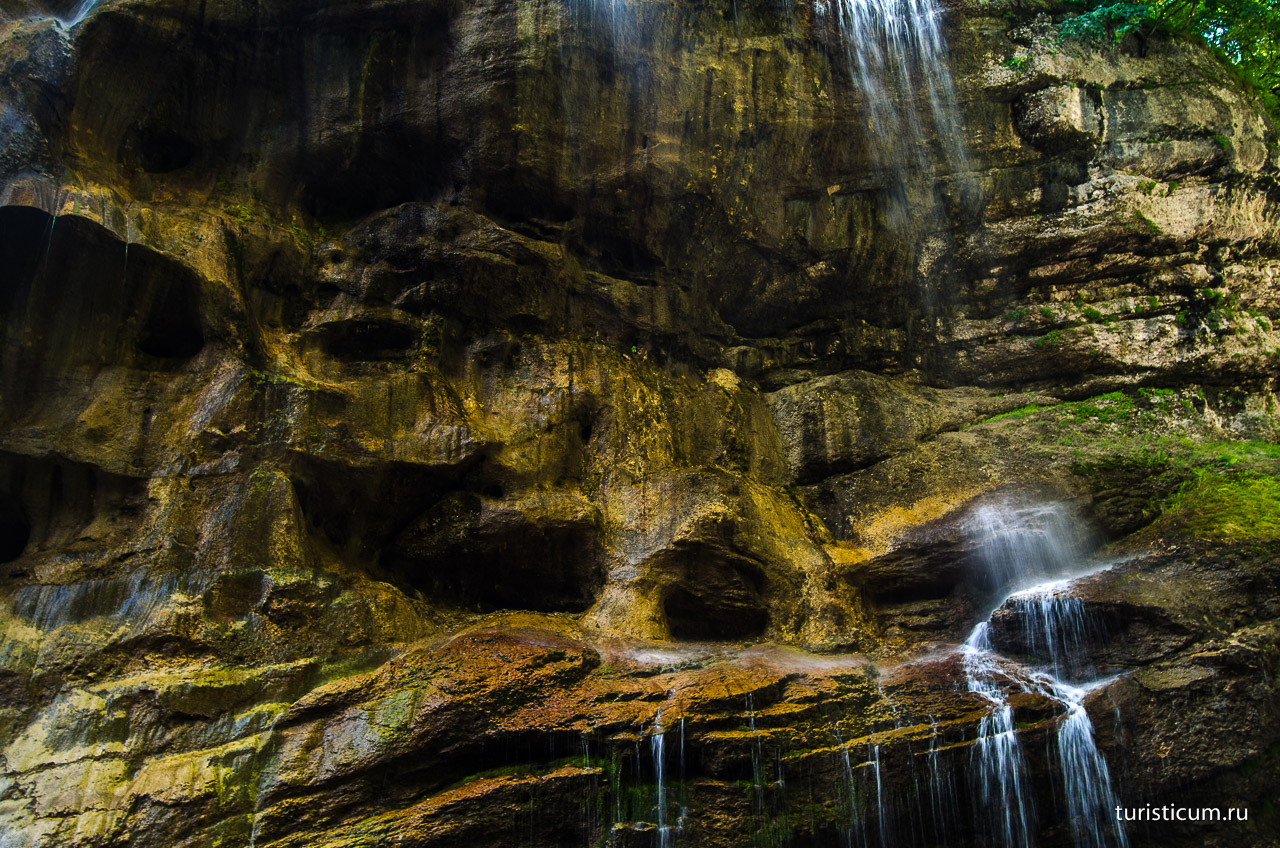 Второй водопад называется Сакал-Туп – он похож на огромный желоб, по которому непрекращающимся потоком падают вниз сотни литров ледяной воды. Немного южнее от него расположен Главный Чегемский водопад, который еще именуют «плачущим». Струйки воды, проникающие через десятки трещин в породе, вырываются наружу, подобно слезам.