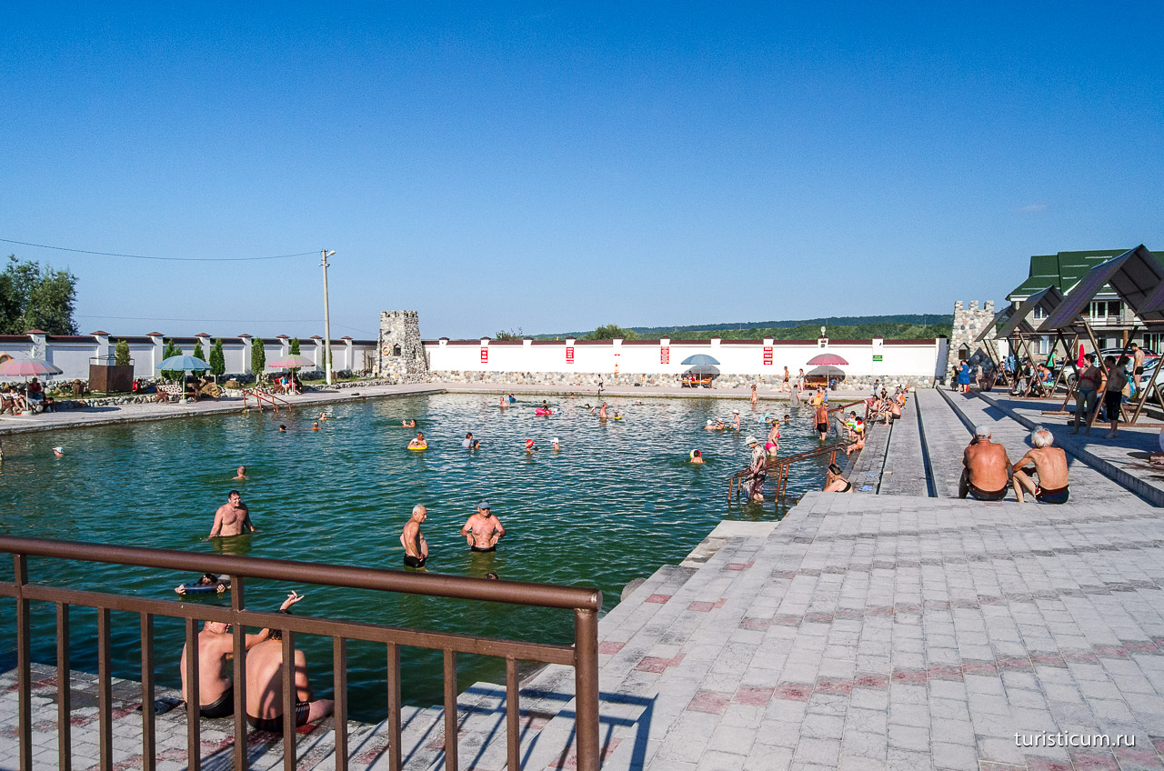 После обеда мы двинулись в Аушигер. С Аушигера до Железноводска 2 часа езды. Под открытым небом нас ждал кафельный бассейн. Вокруг слегка обустроенная площадка. Ремонт в Ашигере последний раз проводился никогда. Облагорожен бассейн был если судить по виду годах в 70-ых (± лет 10).