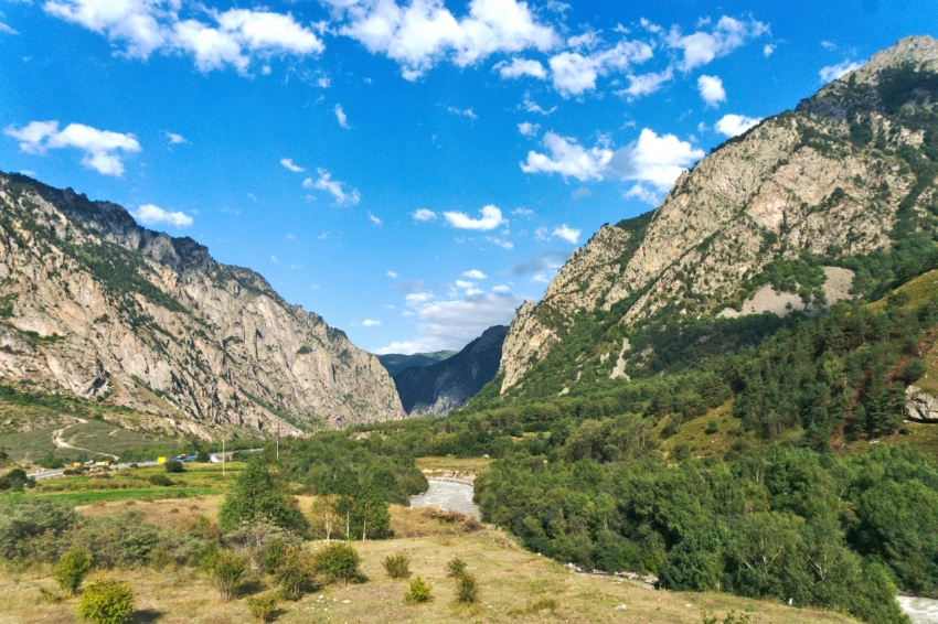 Есть ущелье Кабардино-Балкарии, которое ведет к главной достопримечательности этой области – к главному «порталу» для пешего восхождения на Эльбрус. Речь о замечательной асфальтовой дороге А-158, бегущей вдоль речки Баксан. Водоем имеет исток на самой высокой вершине данной возвышенности, Ясно: река эта самая высокогорная в России. Дорожное направление стартует от поворота, до которого вы добираетесь по Р-217 «Кавказ» (как раз в городке, который носит имя реки). Само же ущелье начинается в районе среднего течения Баксана, у аула Заюково. Река спускается с одноименного ледника, с высоты. Дорога поднимается до ущелья Азау (так называется самый верхний финиш трассы – 2500 метров). Само ущелье Азау поднимается в итоге до Баксанского ледника. Тот лежит уже на высоте 5610 метров и выше. Погода в теснине как в холодном кластере умеренно-континетального климата. Даже в июле не теплее 15°С.