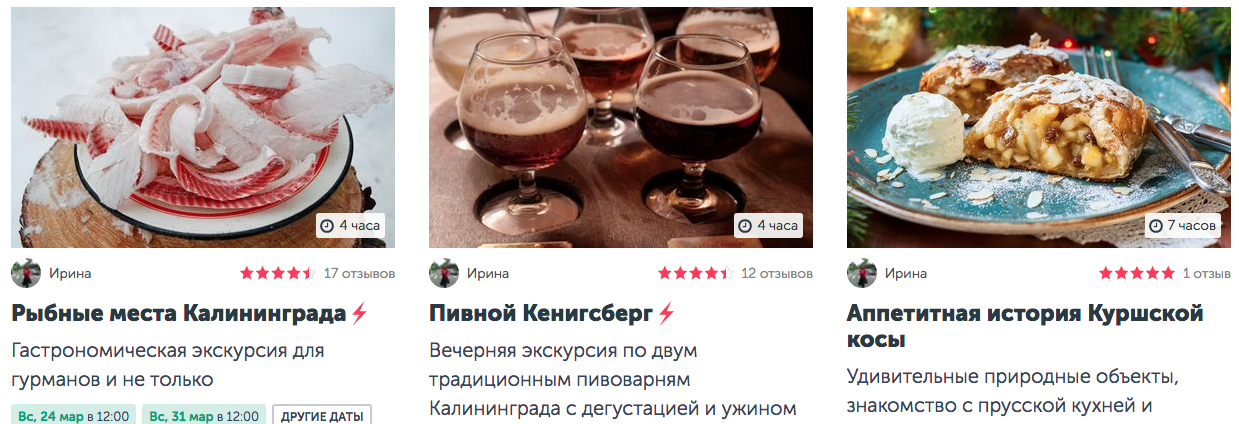 Гастрономические туры по Калининграду и области можно найти на сайте Трипстер, там местные гиды предлагают необычные экскурсии: Например, Ирина предлагает гастрономические туры.