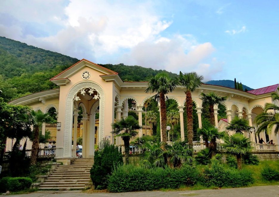 Обязательно сделайте фото со львами, «охраняющими» Зимний театр — его линии знакомы всем поклонникам советского кино по фильму «Зимний вечер в Гаграх». Лучший выбор сувениров здесь же, неподалеку, у Колоннады. А вот за отличными видами отправляйтесь к горе Мамзышха, на ней оборудованы сразу 3 смотровые площадки.