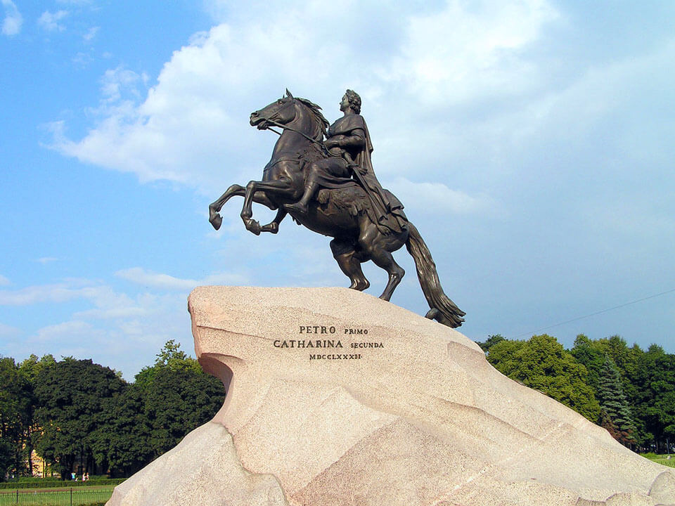 Первую конную статую из бронзы создал Растрелли, но Екатерина II приказала создать новую. Победил проект, предложенный Морисом Фальконе. К вершине отвесной скалы на могучем коне взлетает всадник с лавровым венком на голове.
