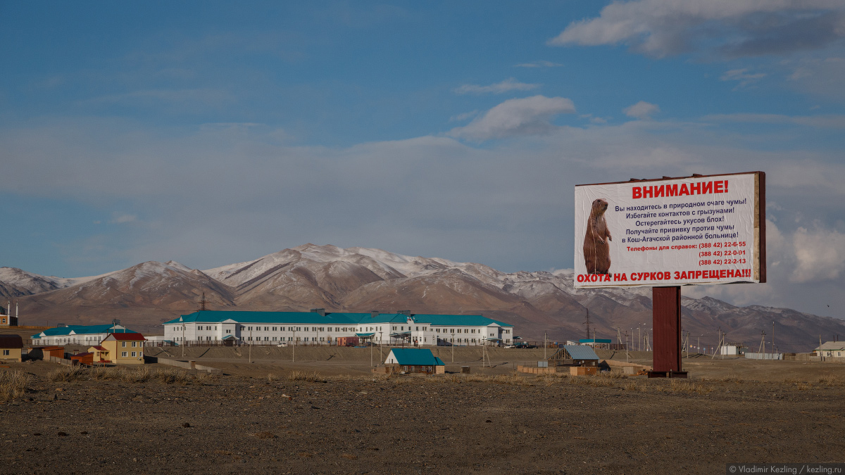 Чуйская степь — природный очаг чумы. По всему Кош-Агачу установлены огромные рекламные щиты с напоминаниями, что ловить и есть грызунов не стоит.