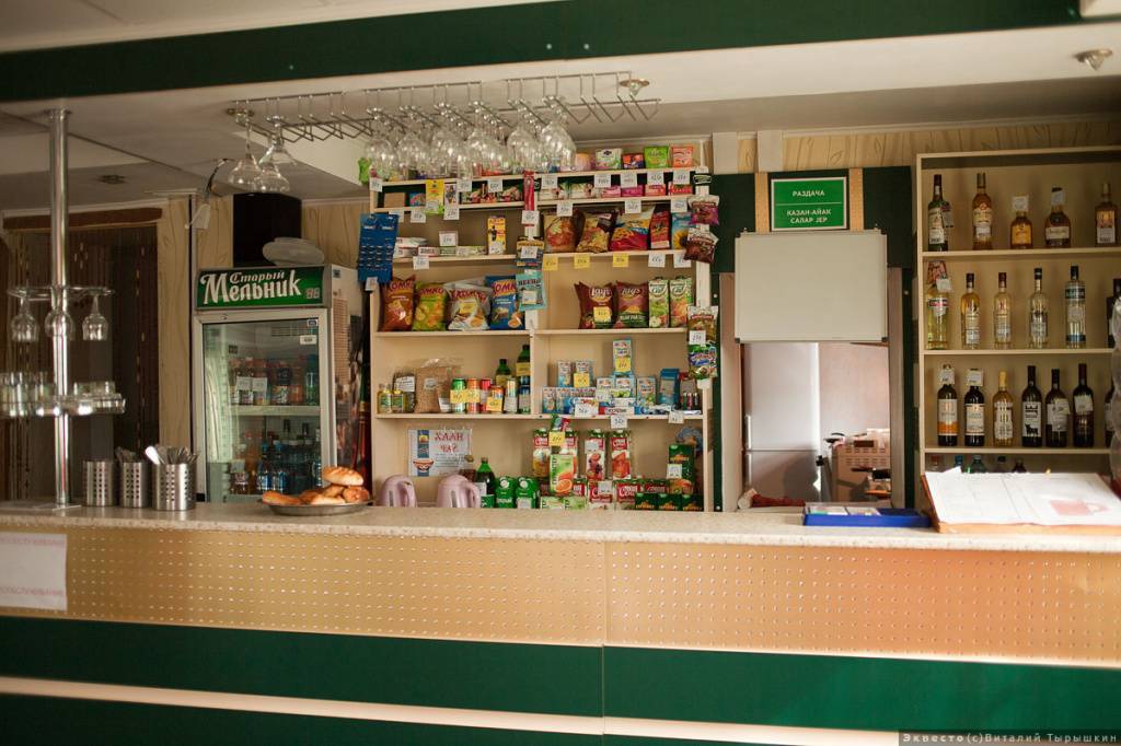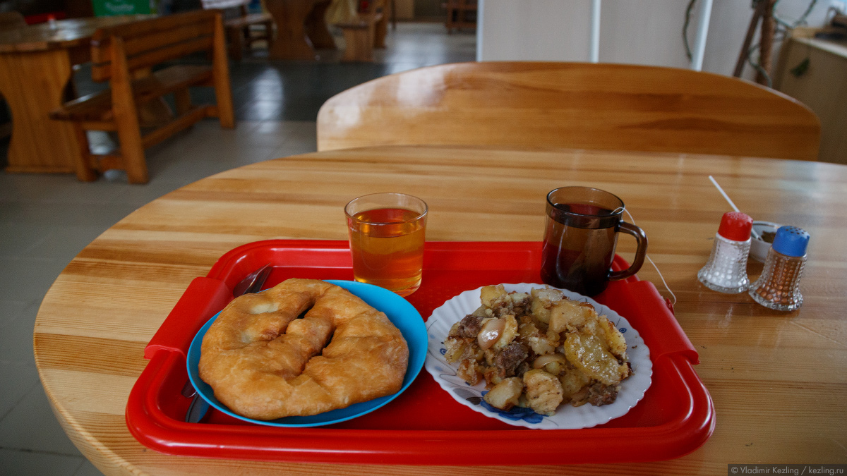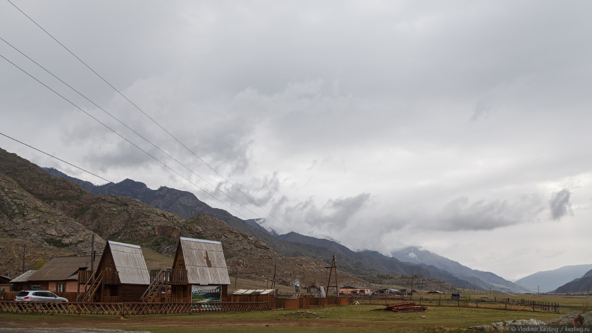 Рядом с кафе построено несколько домиков-курятников, в которых можно переночевать за тысячу рублей с комнаты. Всего их тут две — одна на первом этаже, вторая — под крышей. О каком-либо комфорте говорить не приходится, но это — проблема всего Горного Алтая: довольствуемся тем, что есть. А есть тесная комнатушка с двумя кроватями и дырявыми стенами, в щелях которых гуляет холодный ветер. Из положительного — электричество: лампочка, свисающая на проводе с потолка да видавшая виды старая розетка. Удобства — через дорогу: туалет гравитационного типа (читай: дырка в полу) да обшарпанный умывальник в кафе.