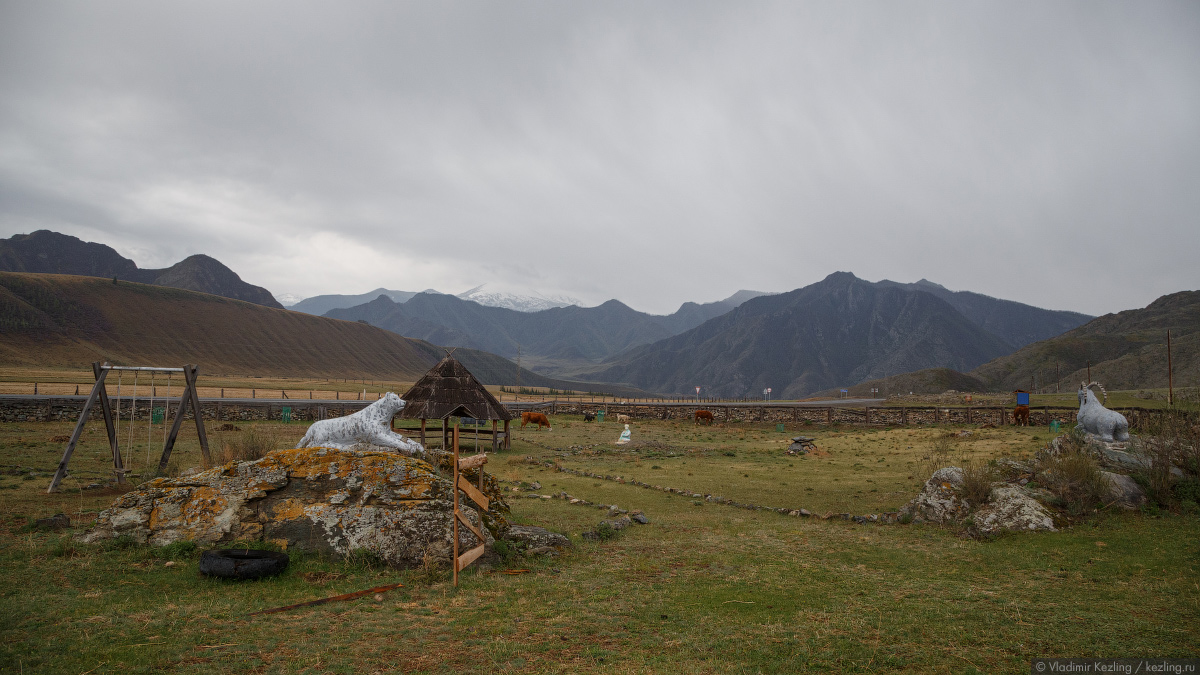 На территории «парка» флегматично пасутся коровы. Вдали белеют заснеженные вершины Алтайских гор. Снег на них не тает даже летом. Местные жители называют такие горы «белкáми».