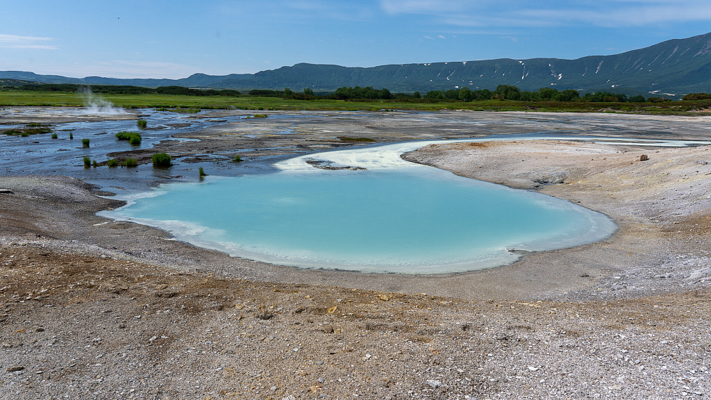 - Экскурсия в кальдере вулкана Узон (1 час). Осмотр фумарольных полей, кислотных и горячих озер, грязевых котлов и вулканчиков Восточного термального поля кальдеры.