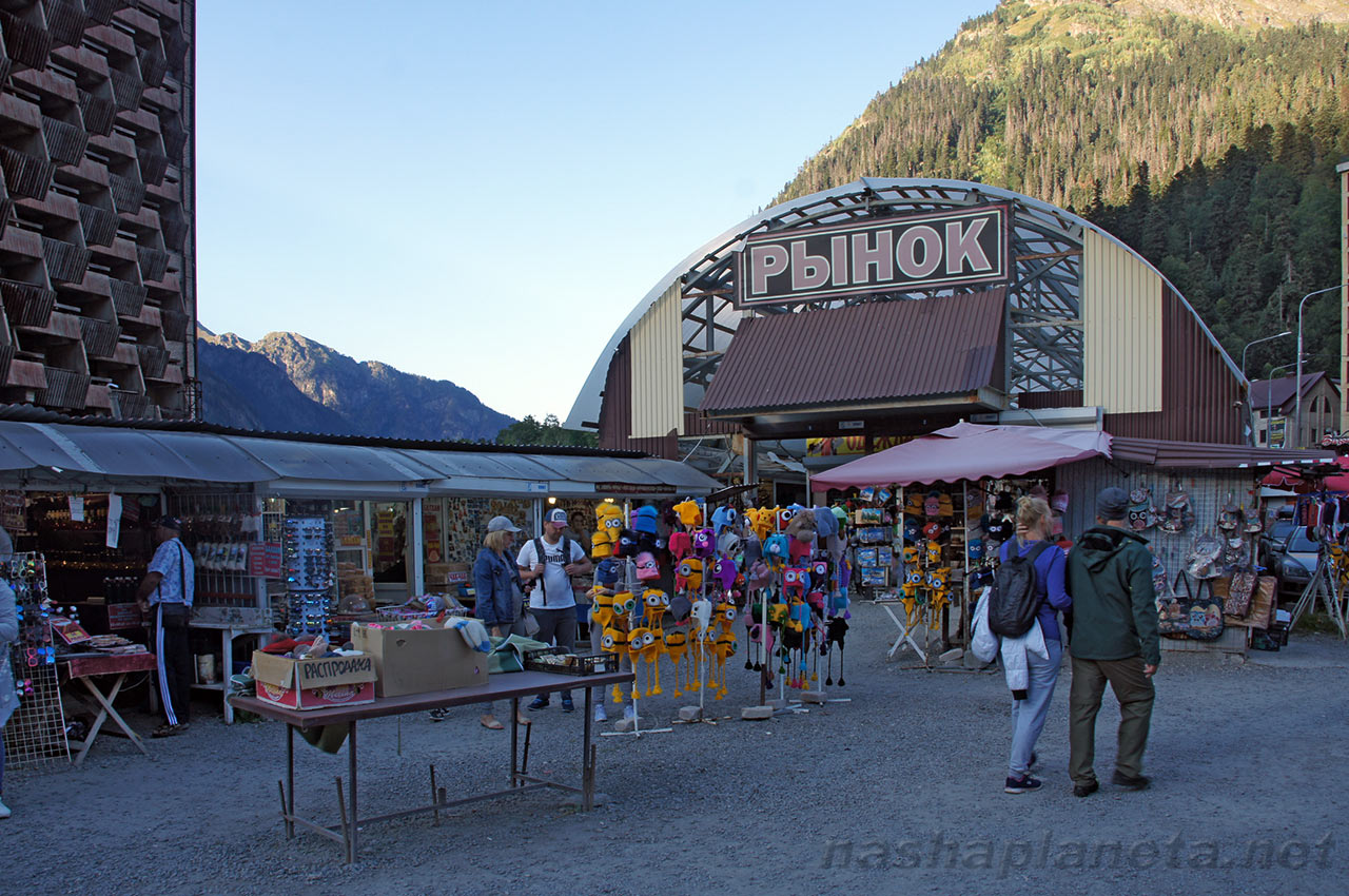 Домбай – небольшой и очень компактный поселок, который весь можно обойти пешком за 30 минут. Он практически полностью туристический: везде есть отели и жилье, предлагаются экскурсии, много кафе и ресторанов. Есть рынок, много магазинов и лотков с сувенирами и товарами для туристов. Сетевых супермаркетов здесь нет, но купить в местных продуктовых магазинах можно практически все то же самое, только цены на популярные товары и продукты в полтора-два раза выше, чем в сетевых супермаркетах в крупных городах даже по соседству. Если нужно сэкономить и вы будете готовить сами, то есть смысл закупить продукты в ближайшем сетевом супермаркете «Магнит» в Карачаевске при съезде на дорогу в сторону Теберды и Домбая. Пластиковые карты принимают не везде, поэтому лучше всегда имейте с собой наличные. Некоторые продавцы принимают в качестве оплаты онлайн-переводы. В центре есть отделение Сбербанка и круглосуточный банкомат, а вот банкоматов других банков нет.