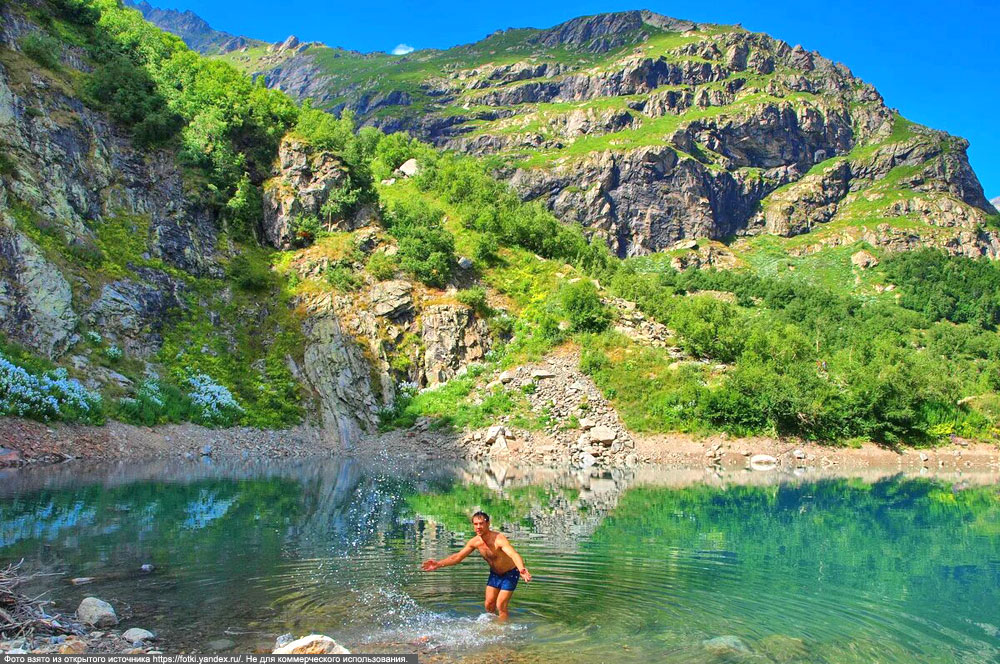 Поход в Домбай в июле не обходится без посещения уникальных горных озер – они в эту пору также отличаются полноводностью. Глубокие чаши водоемов, по краям заросшие изумрудными лесами, давно освободились ото льда и практически полностью заполнены бирюзовыми водами.