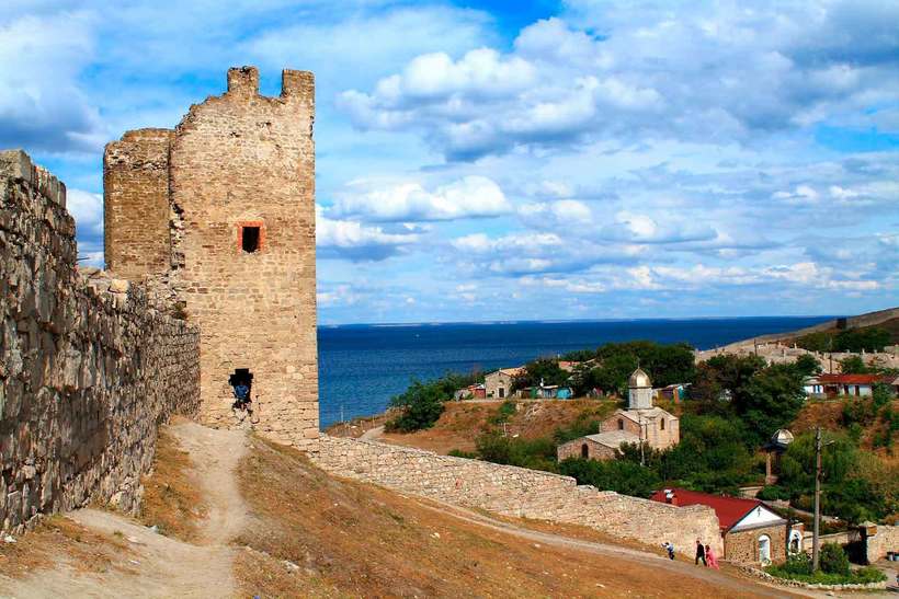 Подарили они Феодосии и главную сегодняшнюю туристическую достопримечательность: оборонительную крепость из известняка постройки XIV столетия. Раньше она огибала территорию в 70 га, а сегодня хорошо сохранилась лишь южная ее часть и несколько башен, среди которых особого внимания заслуживает башня Святого Константина с навесными бойницами.