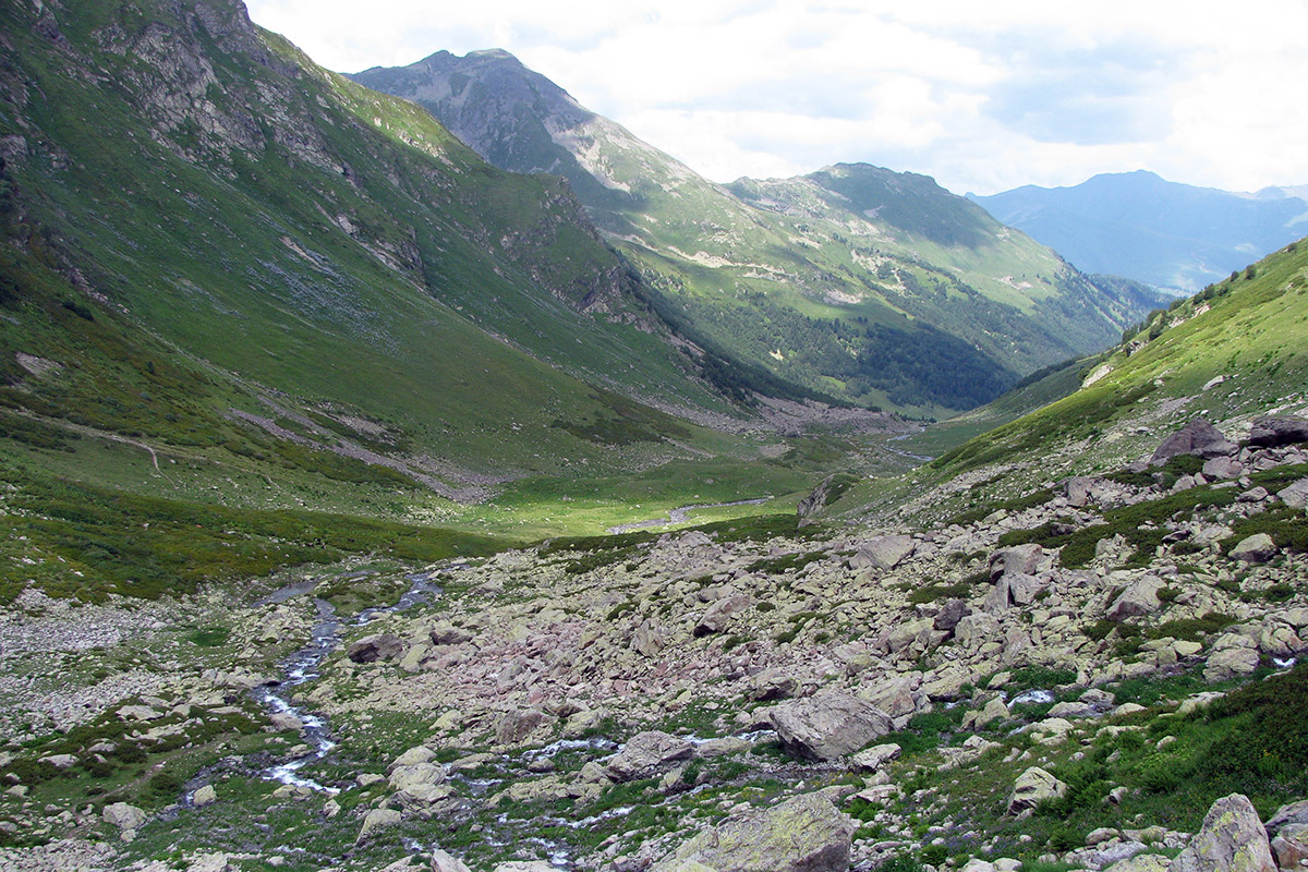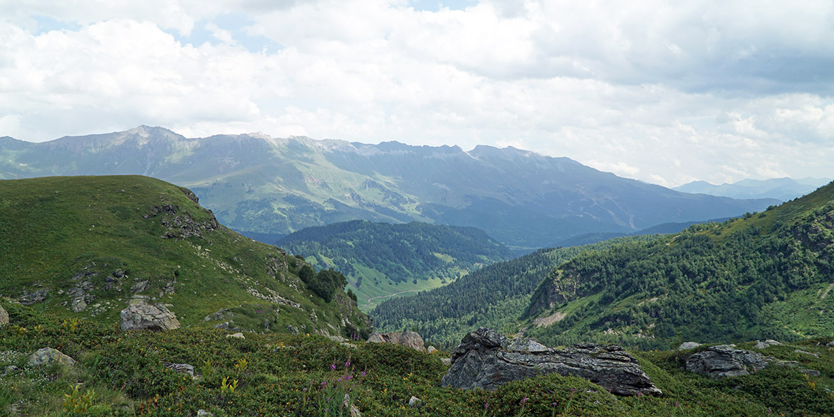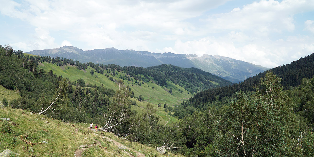 На развилке троп, уже почти на высоте озера Рыбки, уходим в сторону — по правой тропе. Чтобы сделать кадр с видом на долину Малой Дукки. На заднем плане виден хребет Абишира-Ахуба, седловина почти в центре — перевал Федосеева.
