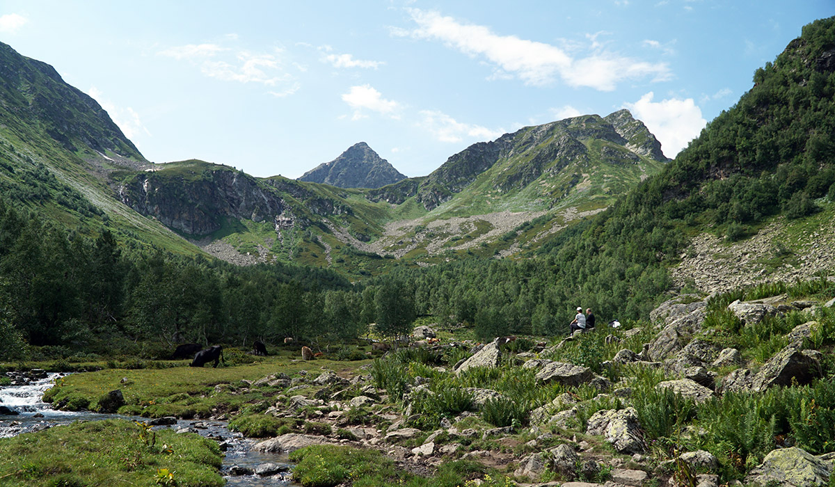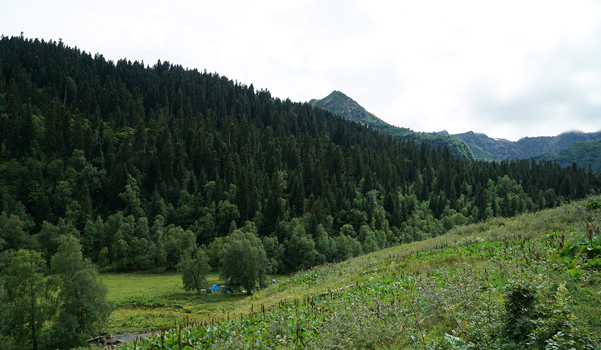 Больших полян в долине Малой Дукки не так много, три или четыре, где можно установить палаточный городок. Координаты нашего лагеря: 43.548968, 41.082956. Мы поставили 5 палаток, еще 2-3 легко разместить здесь же. Внизу на фото (снято с дороги от асфальта до коша) под березками спрятаны наши палатки, река рядом, виден небольшой кусочек.