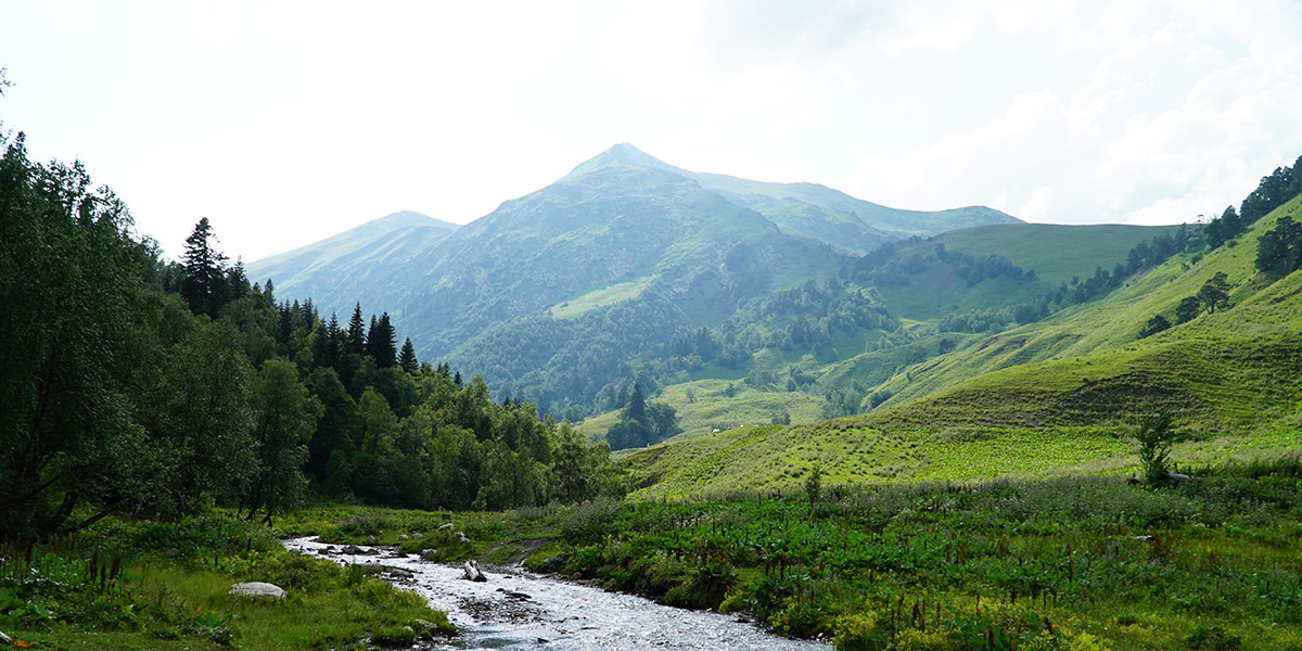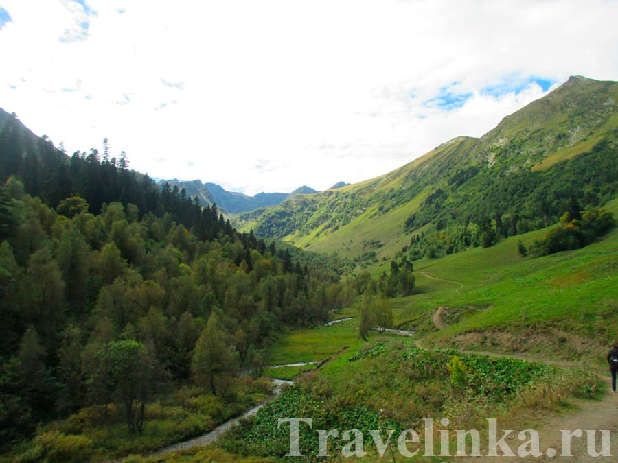 Гиды посоветовали правильную тропу — немного спуститься по правому берегу ручья (смотрим от истока к устью) и далее идти траверсом к Сказке Кавказа