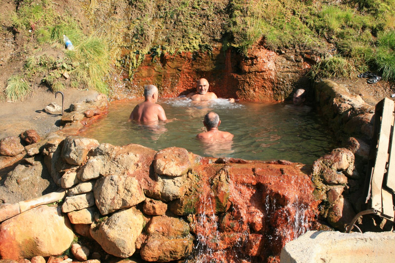 Если приехать в Джилы Су в самый сезон (июль-август), то обычно тут в ванной очень тесно. На следующем кадре показано, как один из купающихся мужиков прислонился спиной к выходящему напору воды. Вот такое вот натуральное термальное джакузи. По снимку видно, что камни стали такими красно-бордовыми от минеральных отложений от воды.