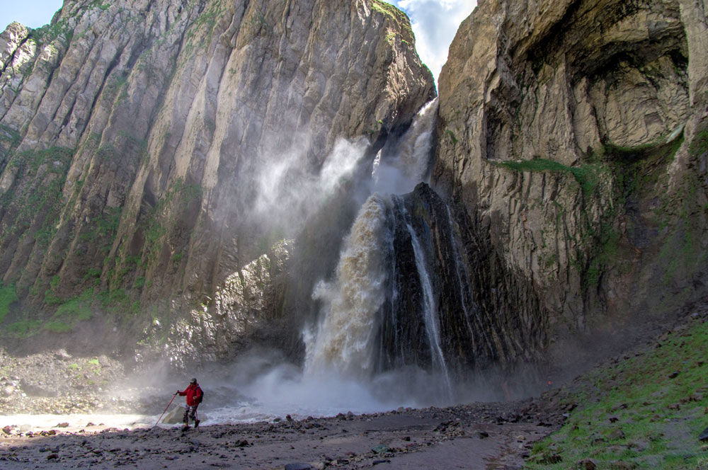 Водопад Султан, после дождя водя темная, даже сливается со скалами. Справа видно начало тропинки на гору.