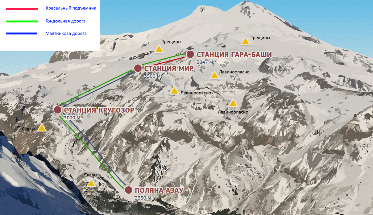 Канатно-кресельная дорога «Эльбрус» начинается от станции «Мир» (3500 м) и идет до станции «Гара-Баши» (3850 м). Однокресельный подъёмник хотя и старый, но работает стабильно. Отсюда, с высоты 3800 м. начинается сертифицированная трасса № 1 до поляны «Азау» 2300 м.