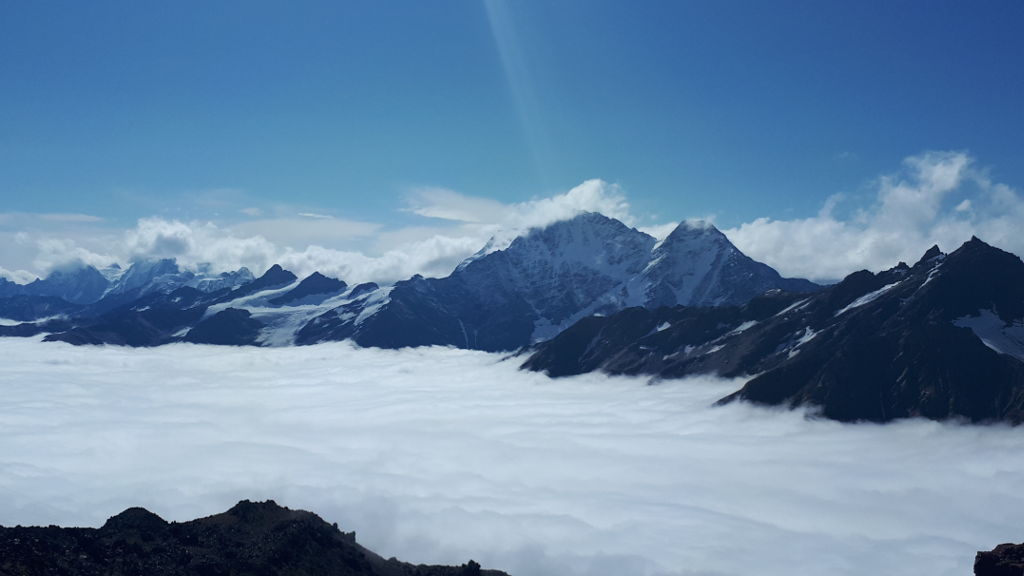 Эльбрус огромен – настолько, что не осознаёшь его размеров и, только глядя сверху вниз на соседние горы, понимаешь, что залез уже выше облаков. В их гуще вдруг открылась одна гора со снежной шапкой – не иначе как греческий Олимп. Где‑то там Зевс махнул на нас рукой: «Что с вами делать, все равно ж попрётесь, идите уж». Он разогнал тучи и показал обе вершины древнего стратовулкана, коим и является Эльбрус.