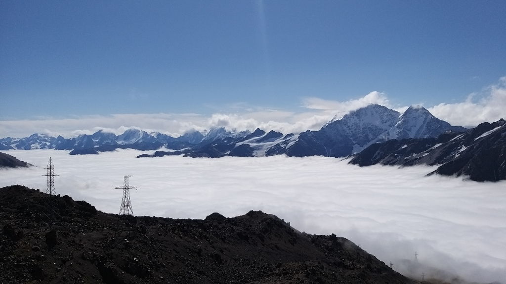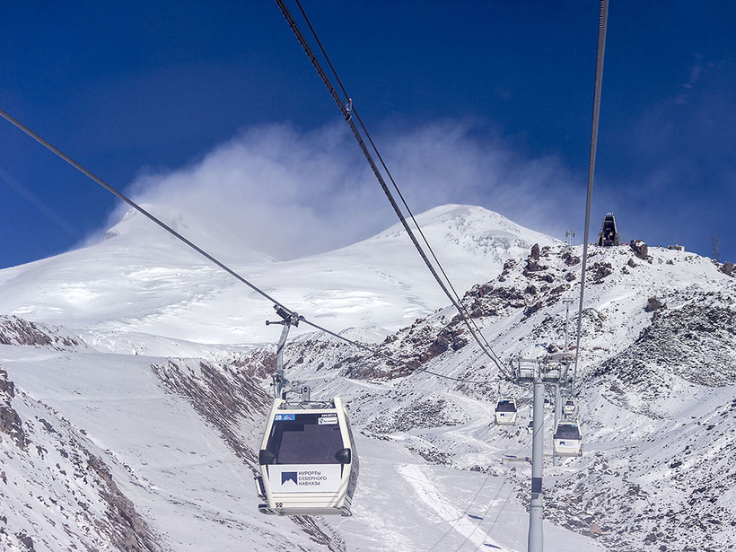 Тех, кто проходит его от самого подножия в долине Азау до вершины на 5 642 м, – единицы. Такое восхождение занимает несколько дней, а хочется же всё и сразу. Поэтому построили три подъёмника. За 1 500 рублей за полчала поднимаешься до отметки 3 850 м. При хорошей погоде, покачиваясь в кабинке подъёмника, можно любоваться долиной Азау и склонами Эльбруса. При пасмурной – тихо скрыться в облаках, чтобы вынырнуть уже за ними и восторженно выдохнуть.