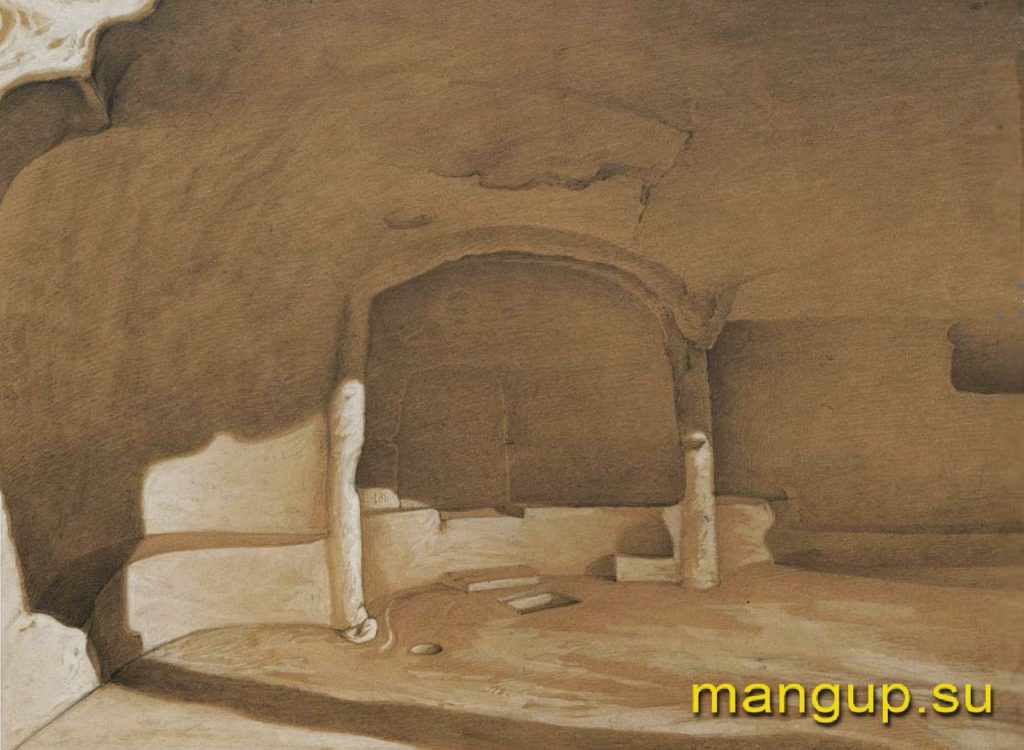 Напротив, входа относительно глубокая (1,7×2,3 м.), если учитывать небольшие размеры помещения, апсида, ранее отделявшаяся от нефа деревянным иконостасом. Престол был высечен в скале. Его изображение можно увидеть на гравюре из неизданного альбома графа Уварова. В 20-х-30-х гг. нашего века он уже был сбит и опрокинут . Вдоль северной стены храма широкая скамья или лежанка, высотой около метра, которая могла использоваться для отпевания покойника , аналогичная, но более узкая конструкция видна у южной стены.