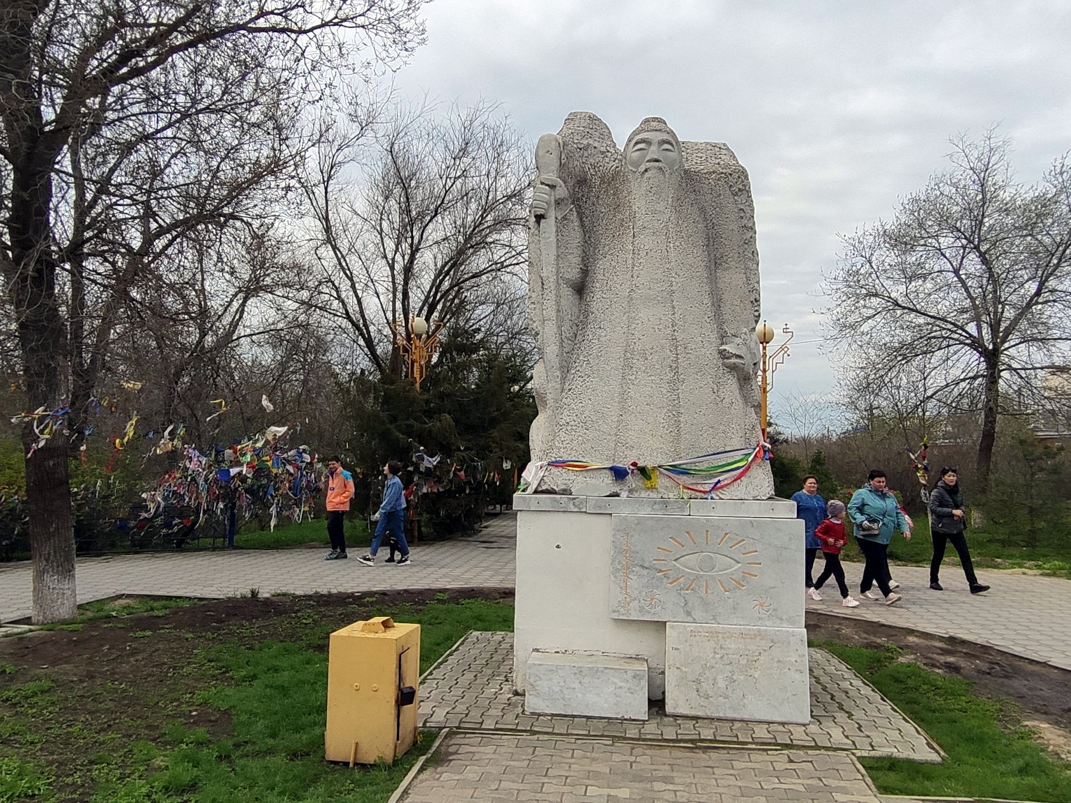 Рядом со статуей Белого Старца — покровителя калмыков Цаган Аав, завязывают цветные ленточки.