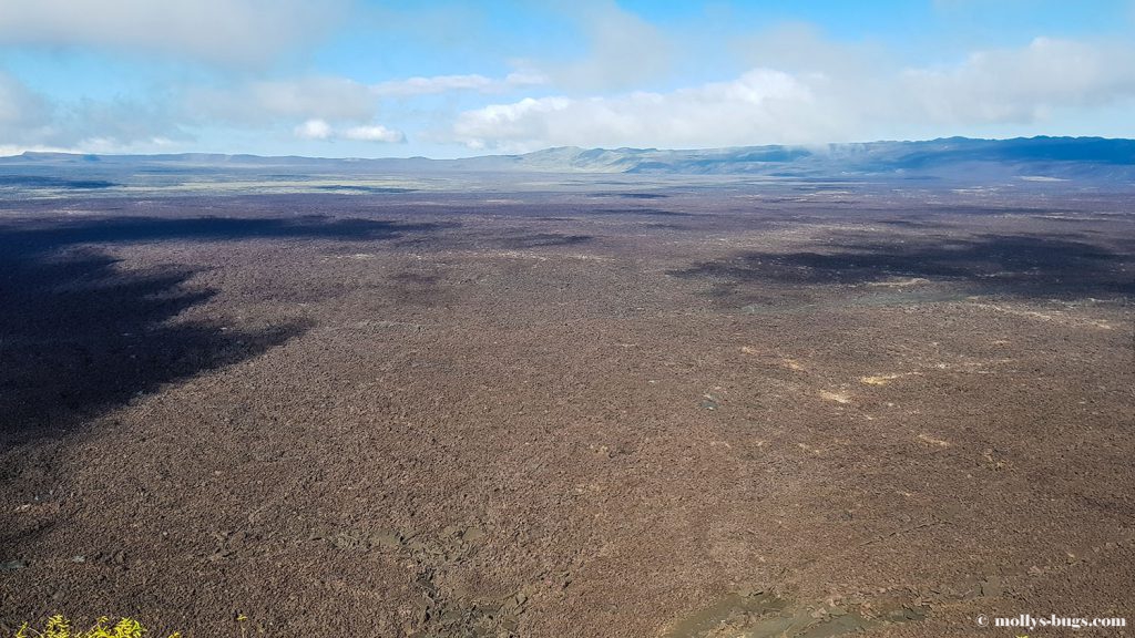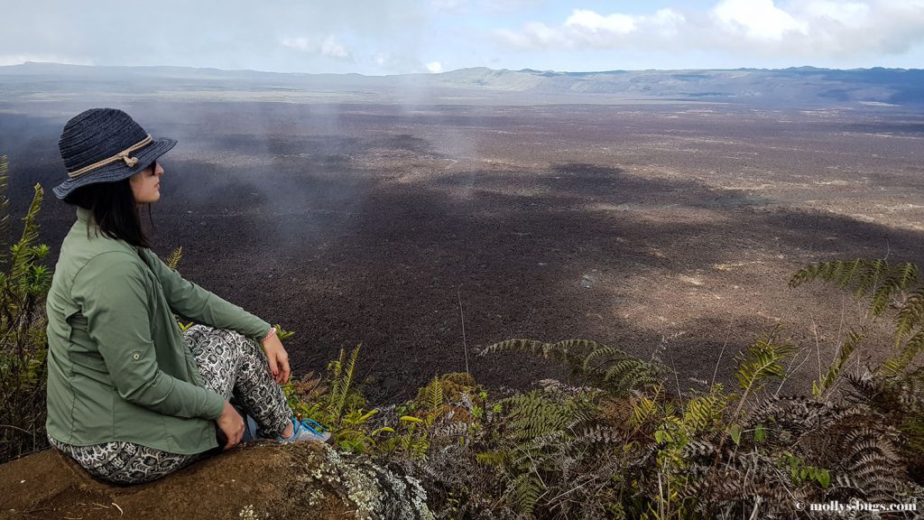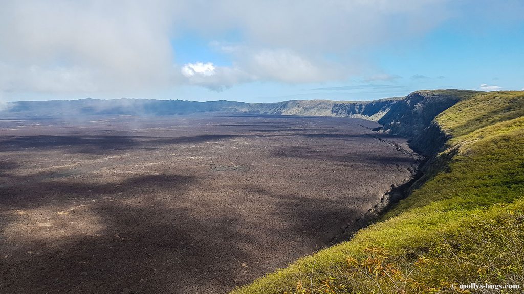 Это совсем дешевая экскурсия, и зайти на этот вулкан не составит никакого труда — туда идут и взрослые и дети. Желательно только надеть треккинговую обувь и закрывающую руки одежду, потому что днем солнце очень активное. Вас довезут до подножья вулкана на специальном открытом грузовике, и оттуда уже вы начнете свое восхождение. Путь наверно займет 40-50 минут, и если повезет с погодой и не будет тумана, то на вершине вам откроется очень красивый вид на огромный кратер. Он является самым большим на Галапагосских островах, и вторым по диаметру в мире (со слов нашего гида). Диаметр его кальдеры составляет 10 км. И последний раз он извергался в 2005 году, но несмотря на такой долгий перерыв он все равно остается активным. Поэтому вулканологи очень внимательно следят за ним и остальными вулканами на острове Исабела. Сьерра-Негра – это щитовой вулкан, который по своему строению идентичен Гавайскому вулкану Килауэа, который является самым активным в мире. Это означает, что у него кроме основного кратера, есть еще и дополнительные паразитарные кальдеры, и они также могут извергаться независимо друг от друга.