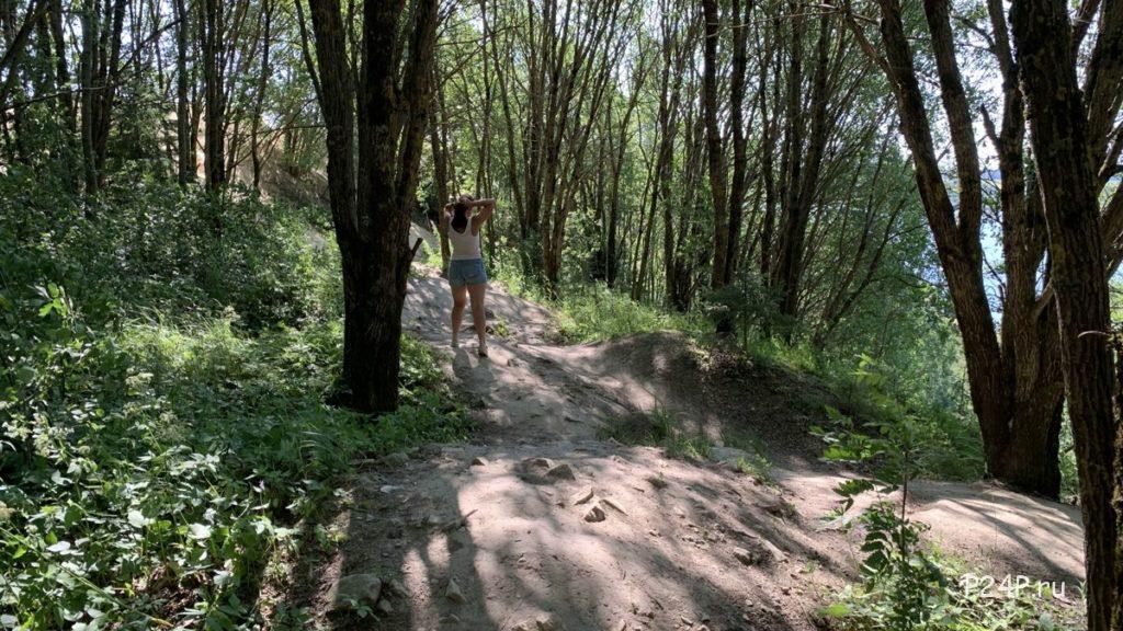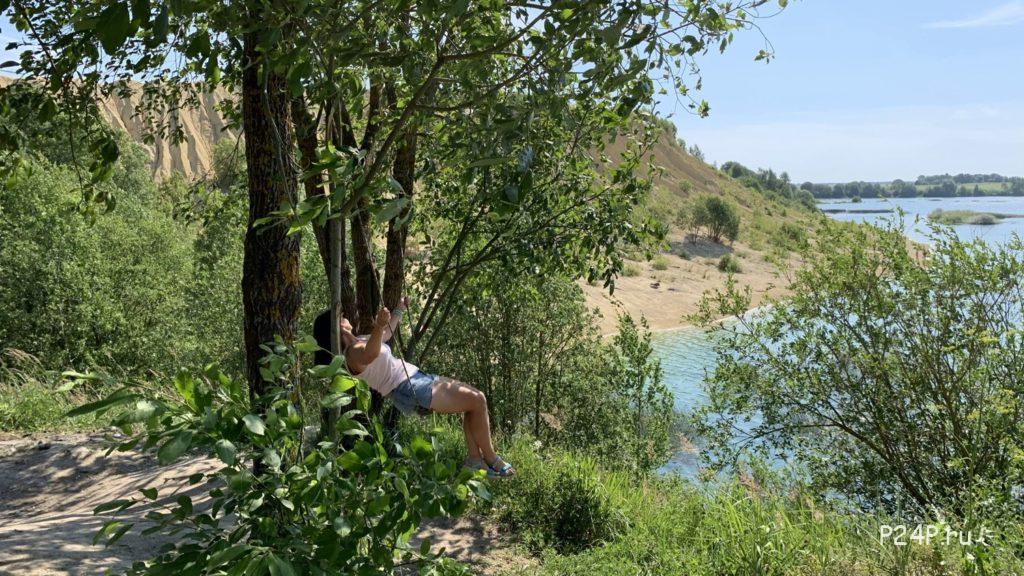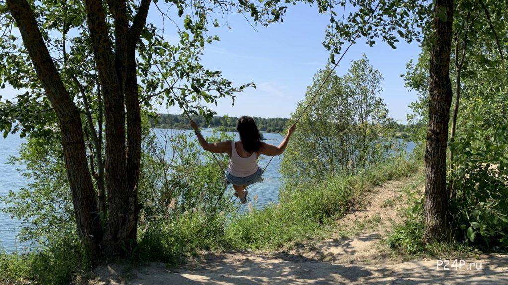 После того как пройдёте метров 500 по лесной дороге выйдите к обрыву с красивым видом и качелями над обрывом.