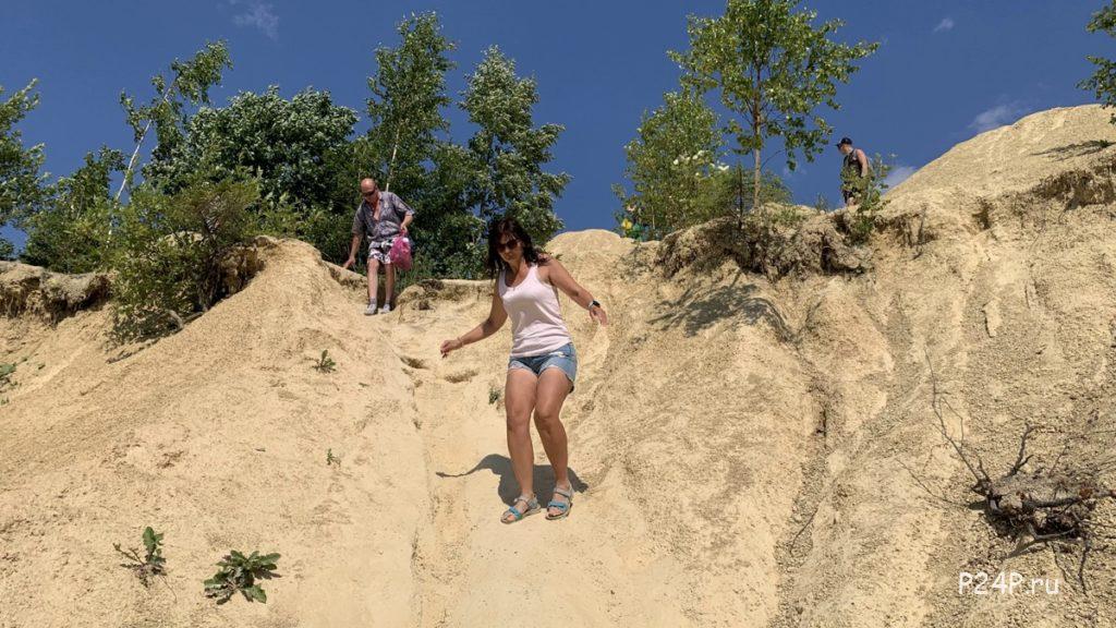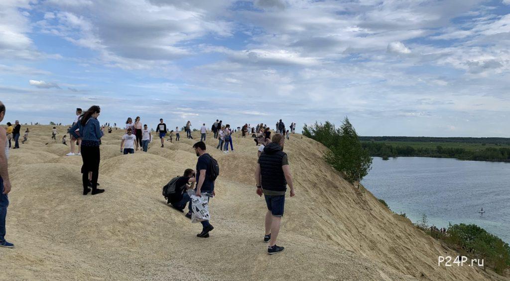 Спуск к пляжу есть с двух сторон карьера. Мы поднимались на барханы от села Новое Хинколово, прошли по ним вдоль озера и спустились с другой стороны. Спуски очень крутые.