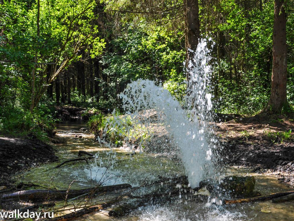 Брызги фонтана падают в небольшой ручей, впадающий в лесное озерцо, ну и сам гейзер на фоне молодой листвы смотрится удивительно живописно. Правда, впечатление портят следы колес, разъездивших берег рядом с гейзером.