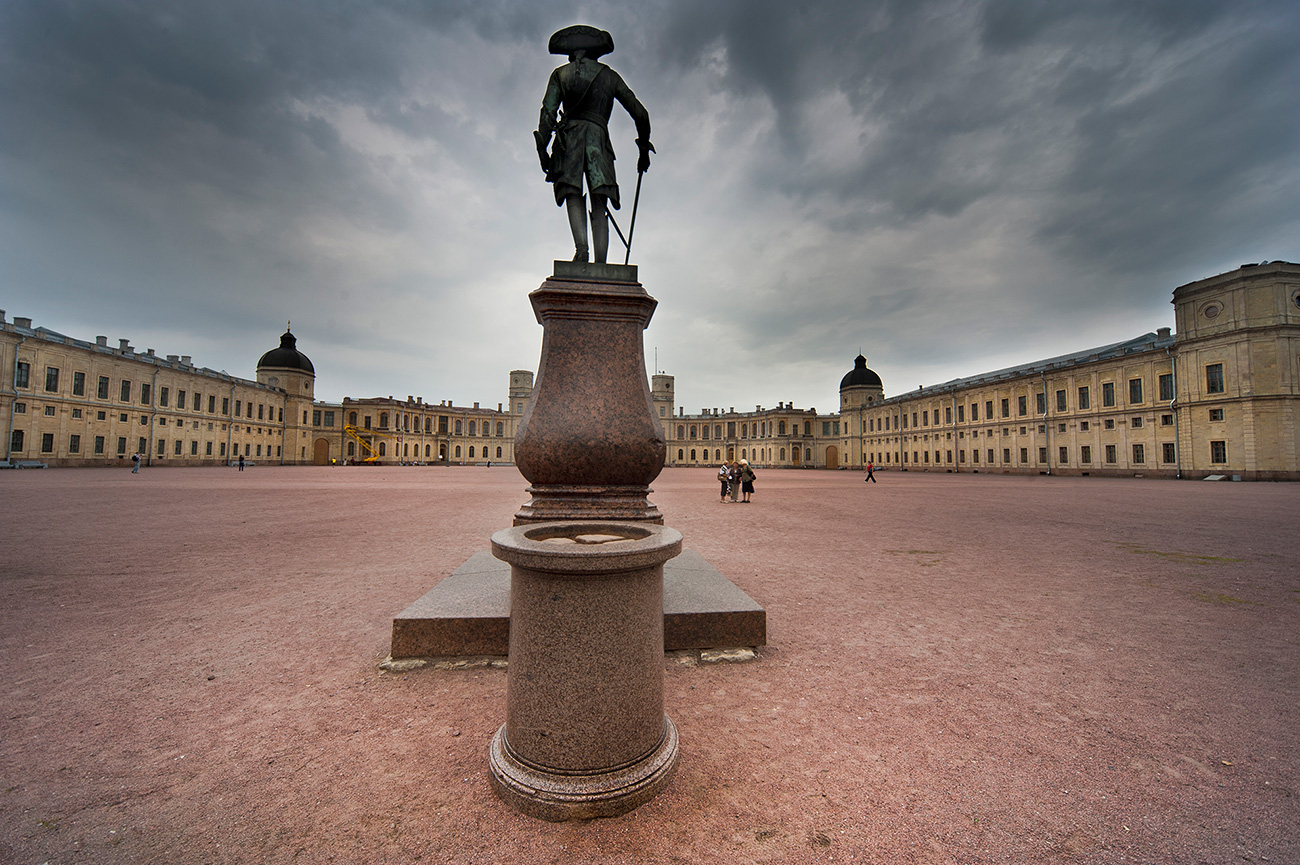 Памятник императору Павлу смотрит на Гатчинский дворец и плац