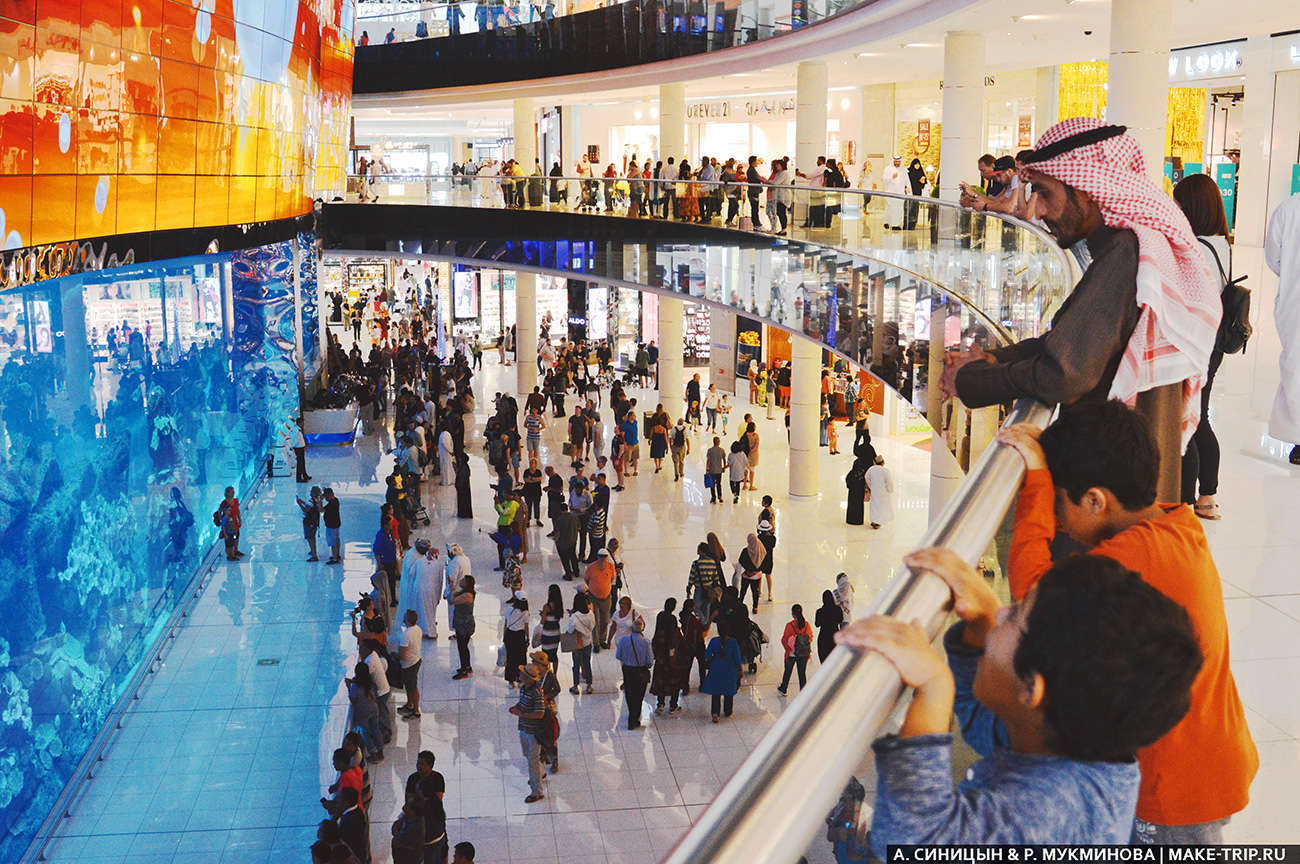 Дубай Молл. Знаменитый аквариум можно посмотреть бесплатно, но только частично, с внешней стороны.